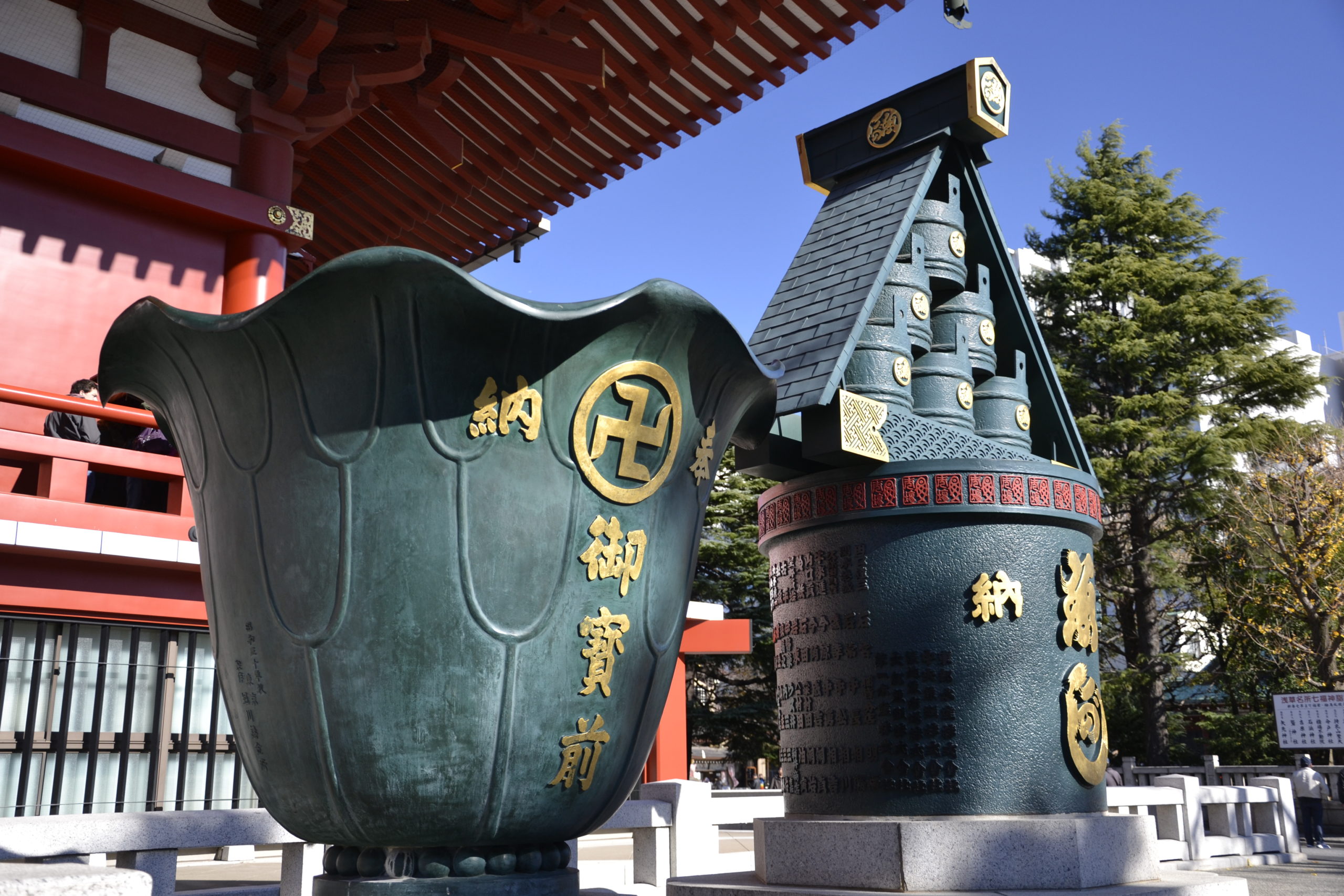 Senso-ji im Distrikt Asakusa ist einer der wichtigsten und ältesten Tempel in Tokio. Der Eingang zum Tempel erfolgt über das Kaminari-mon (Donnertor), das euch direkt zur Einkaufsstraße bringt. Wenn ihr die Straße passiert, erreicht ihr die fünfstöckige Pagode und den Tempel mit dem Waschbecken davor.