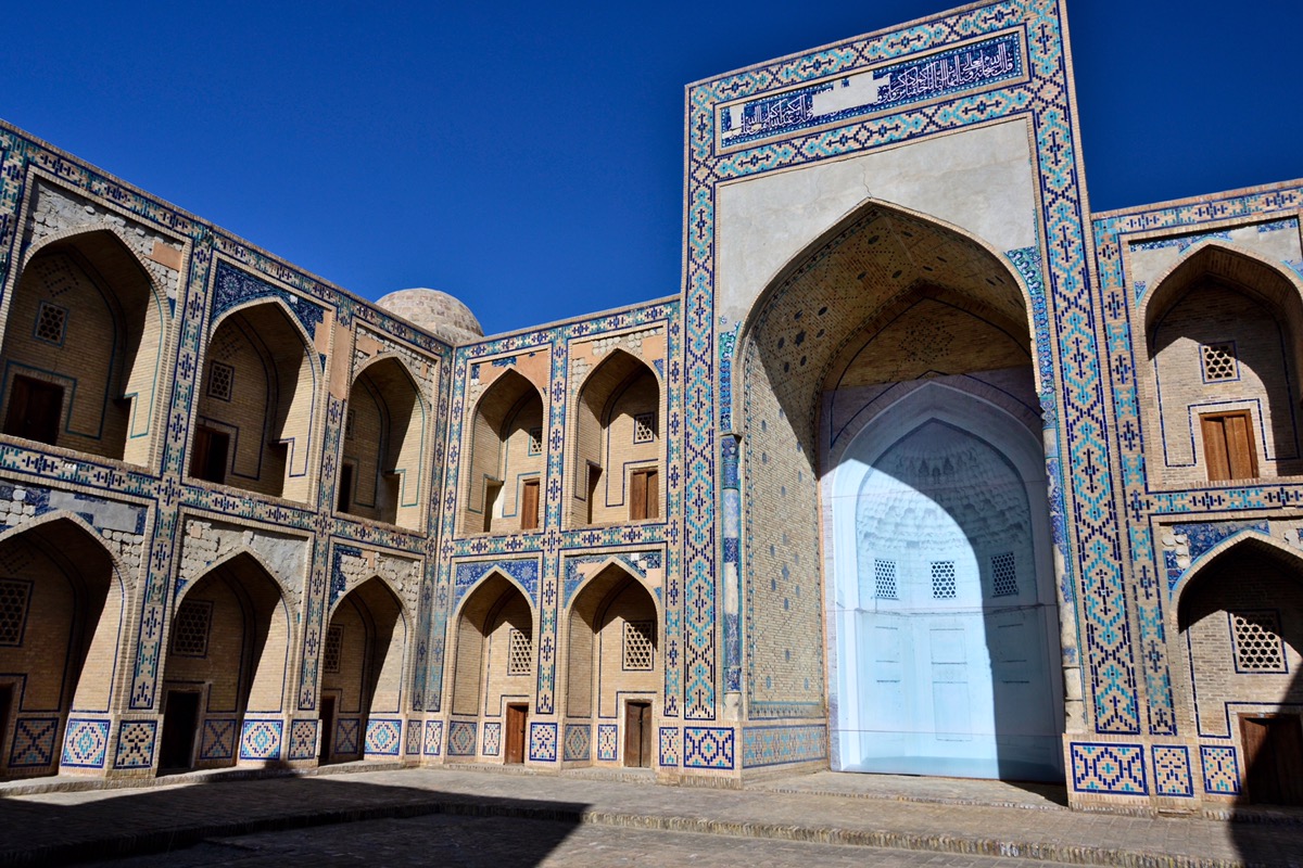 Wir können nicht genug von den schönen türkisfarbenen Fliesen bekommen, welche die Denkmäler schmücken und in großem Kontrast zu dem Sand stehen, der die Gebäude umgibt. Das erste Denkmal, das uns aufgefallen ist, war das vergleichsweise kurze, aber farbenfrohe Minarett. Die wahrscheinlichste Theorie ist, dass der Architekt versprochen hat, dass das höchste Minarett in Buchara und nicht in Chiwa gebaut wird.