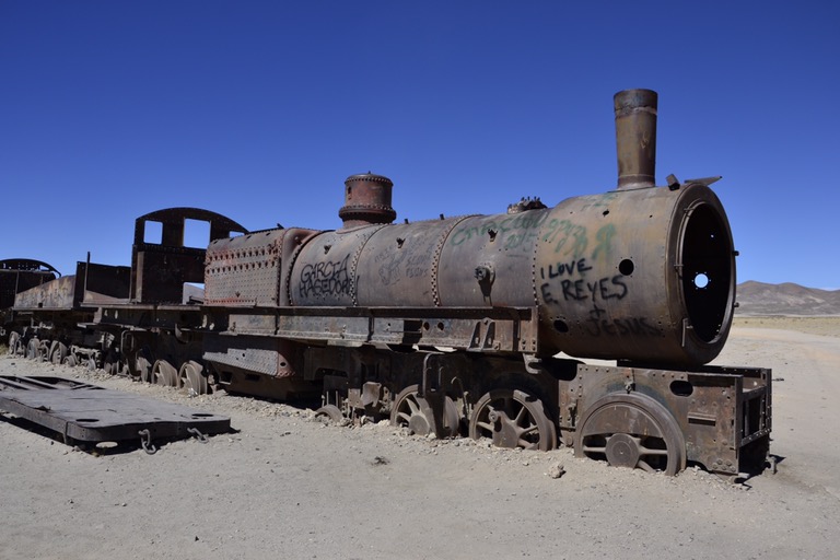 Besides the popular salt lake, there is a train cemetery in Uyuni where a very large number of historic steam locomotives are rusting away in the desert. Some of them are around 100 years old. Unfortunately there is no museum for them. And therefore, pieces from the locomotives have been taken away and used for furniture in bars around Uyuni or for statues in the city center. It is really fun climbing up the trains and walking through this outside free admission museum.