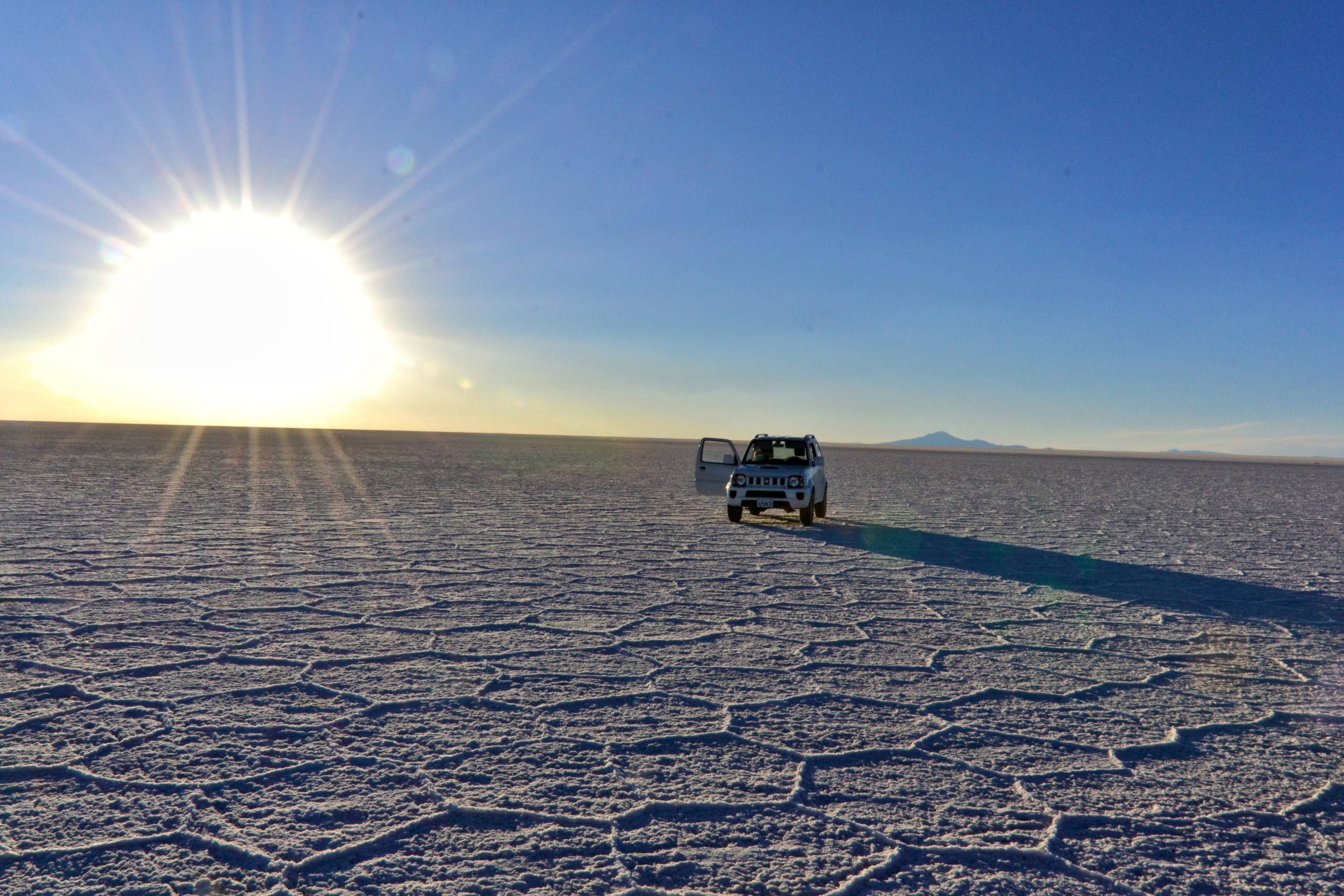 Der Salzsee oder heutzutage die Salzwüste in der Nähe von Uyuni ist mit rd. 10.000 km² die größte der Welt. Das gesamte Gebiet auf 3.650 m über dem Meeresspiegel ist mit Salz bedeckt und sieht aus wie Schnee mit einer interessanten Struktur. Entfernungen sind aufgrund des insgesamt weißen Bereichs nicht erkennbar, was zu merkwürdigen und sehr beliebten Fotos führt. Folglich haben wir an einem einzigen Tag 421 Fotos gemacht…