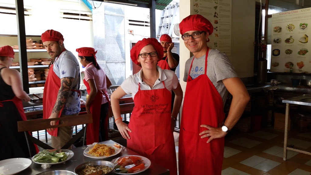 Siem Reap’s center is the old market where we also went shopping for our cooking class we attended. Everybody was able to choose his starter and main course from the menu and we tried fried spring roles and the traditional Khmer dish Amok. Amok is a delicious kind of steam cooked curry served in a banana leaf. We have made this one with Tofu.