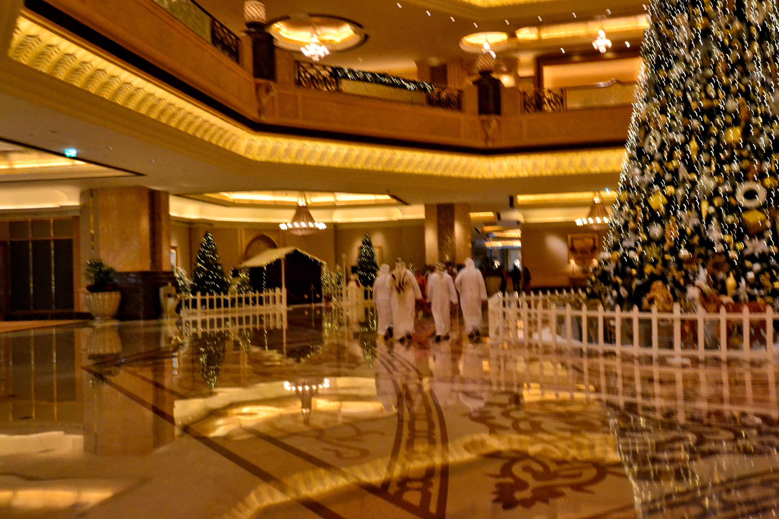 The lobby of the luxury hotel Emirates Palace is open to the public. Entering the entrance hall it looks like in a fairy tale of 1001 nights since almost everything is made of gold. This also holds true for the cappuccino that is served with gold leaves in the café in the basement.