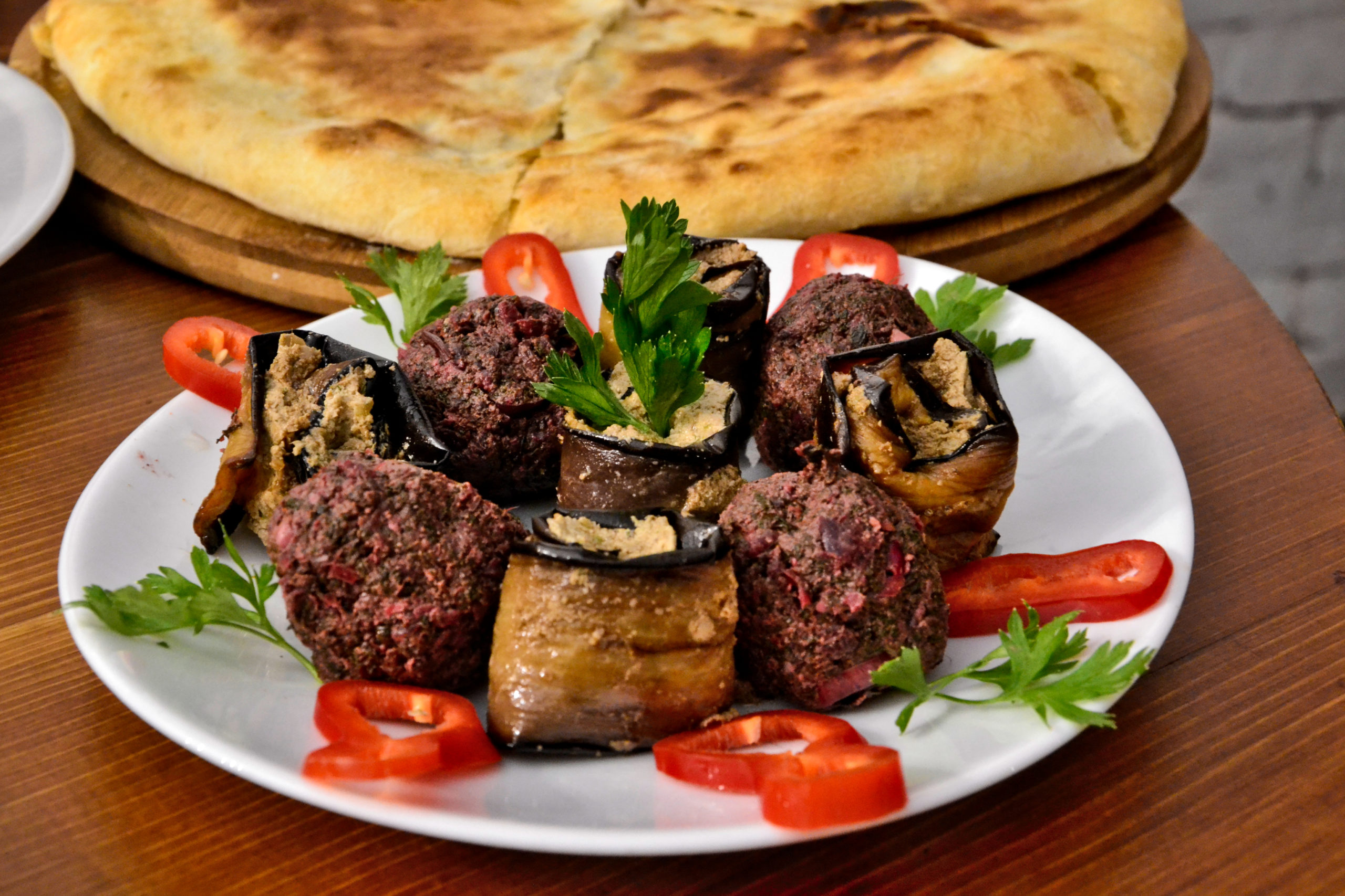 Wirklich unsere beliebteste Vorspeise in Georgien: gegrillte und gerollte Auberginenscheiben, gefüllt mit Walnüssen und dekoriert mit Granatapfelkernen.