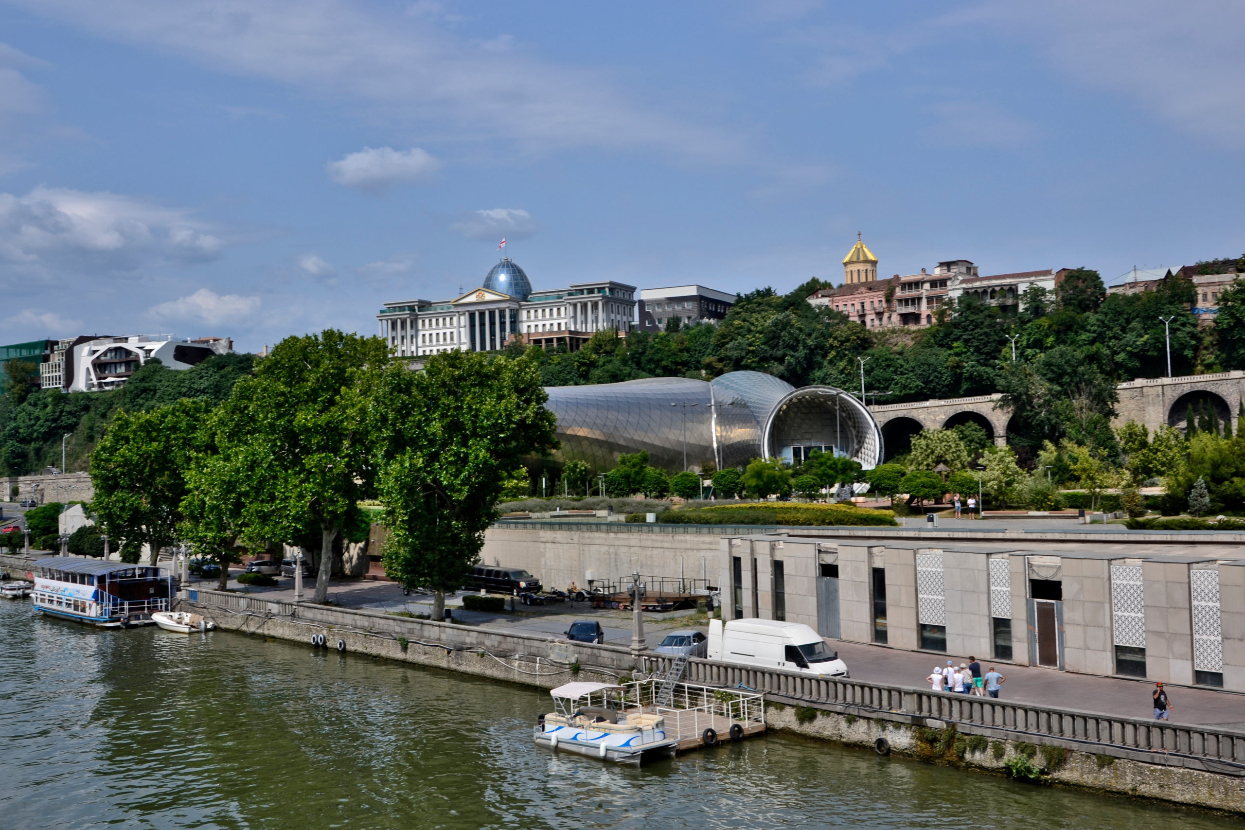 Der futuristische Konzertsaal befindet sich zusammen mit der Friedensbrücke in der Nähe des Flusses Mtkvari. Der Konzertsaal erinnert an einen Lindwurm aufgrund der Röhren, die vom Präsidentenpalast überwacht werden. ????