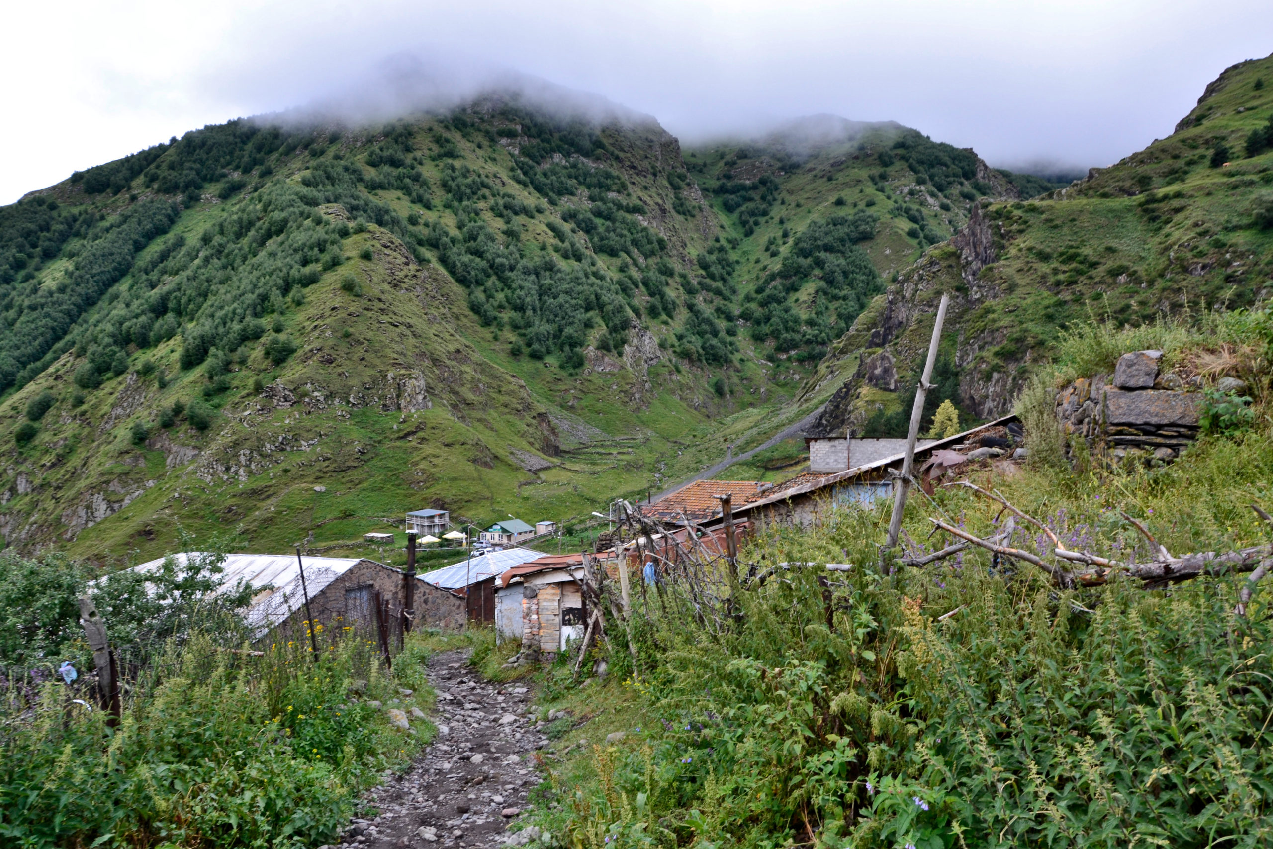 Wir übernachteten in Stepanzminda, um die Zminda Sameba Kirche zu besuchen. Die Kirche auf dem Hügel ist ein beliebter Wallfahrtsort. Da Paul gerne überall hin fährt, mussten wir natürlich das Auto nehmen. Aufgrund des starken Regens in der Nacht zuvor und des Nebels am Morgen waren die schlammigen Schotterstraßen jedoch rutschig und wegen der vorbeifahrenden Busse beschlossen wir, umzudrehen und den in unserem Reiseführer beschriebenen Wanderweg zu suchen. Schließlich erreichten wir die Kirche zu Fuß nach ca. zwei Stunden.