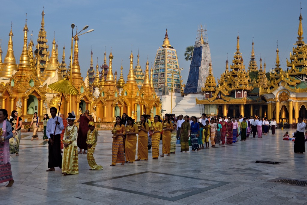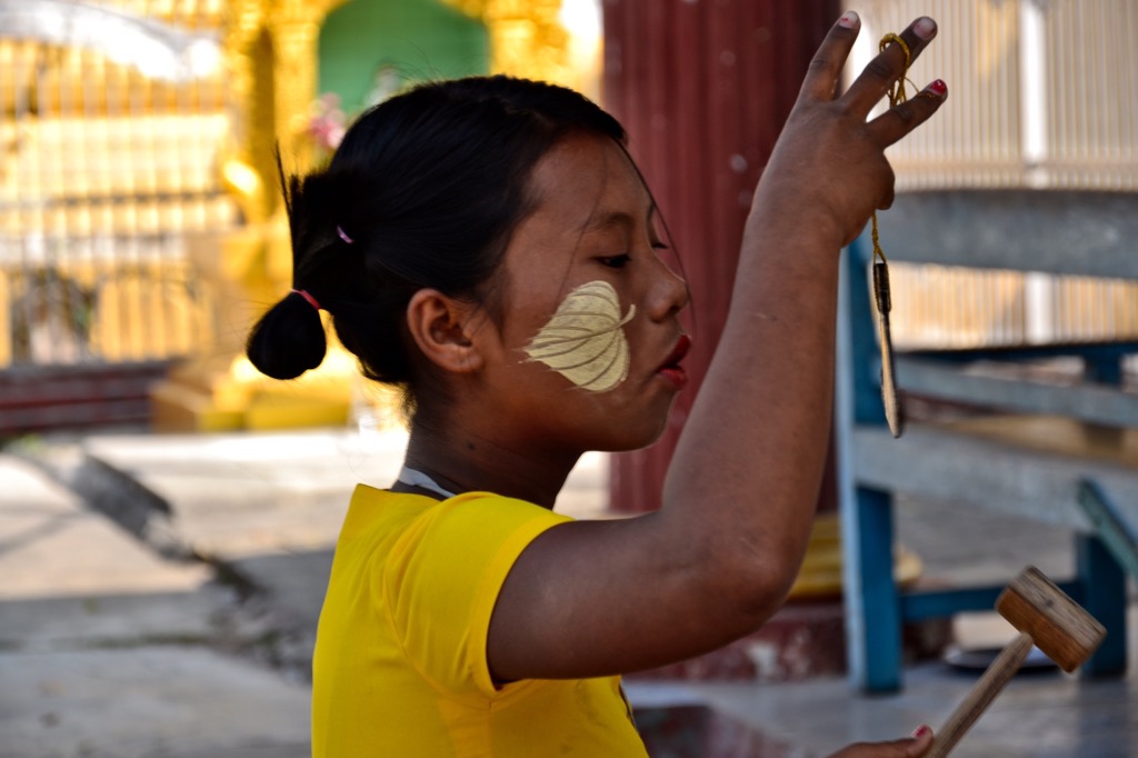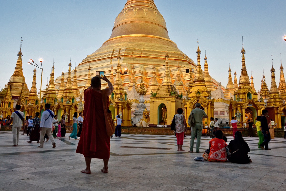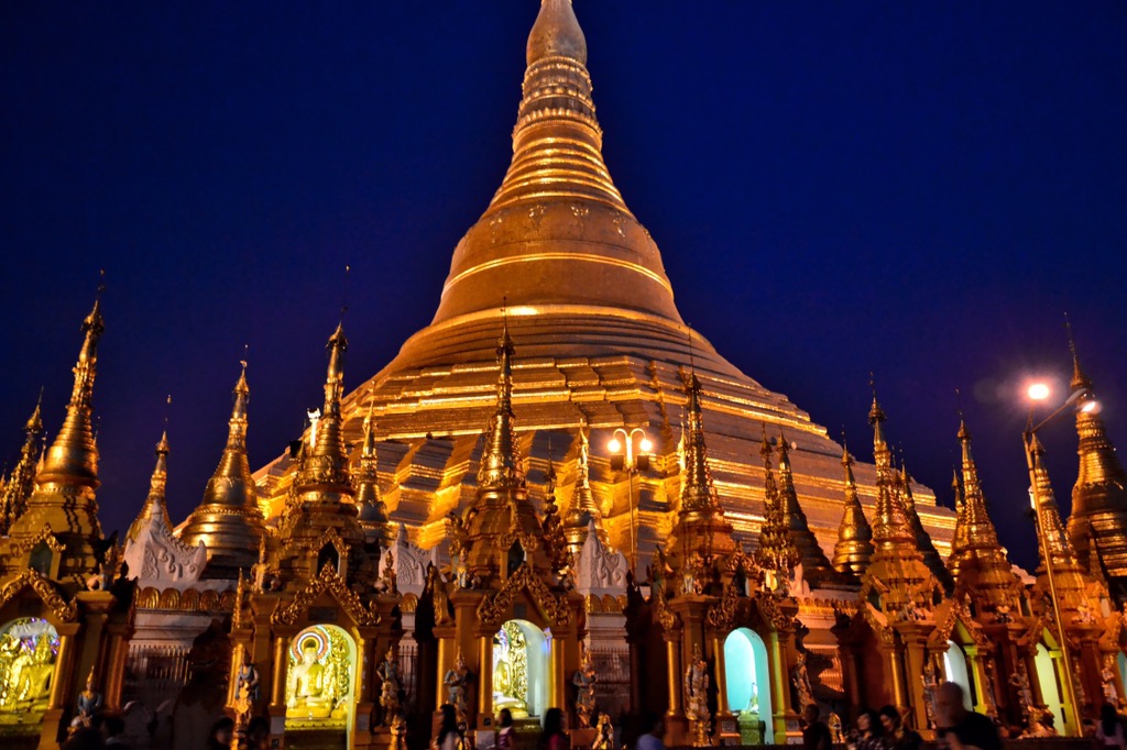 Die Shwedagon-Pagode in Yangon war ein Höhepunkt unserer Reise. Wir haben viel Zeit dort verbracht, um den Sonnenaufgang und den Sonnenuntergang zu genießen und auf dem Gelände der Pagode herumzulaufen. Die Pagode soll rund 2.500 Jahre alt sein. Die Stupa ist ungefähr 100 Meter hoch und mit dem Blattgold wiegt die Stupa ungefähr 150 Tonnen, wovon ungefähr zehn Tonnen reines Gold sind. Alle drei Jahre wird das Gold weggenommen und die Stupa wird völlig neu vergoldet. Der Regenschirm oben hat mehrere tausend Diamanten und Glöckchen.