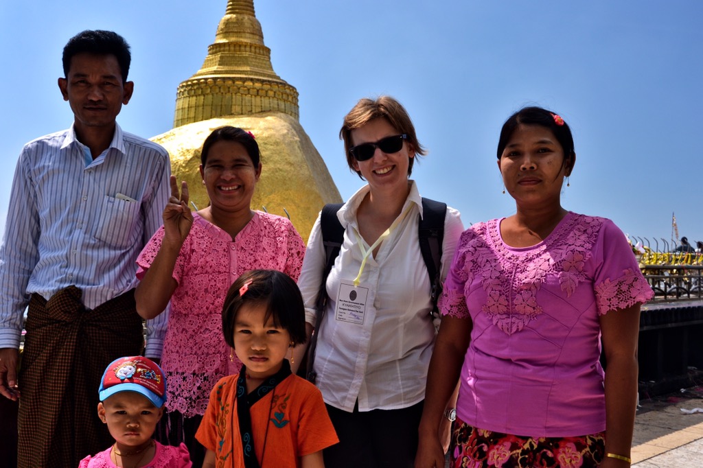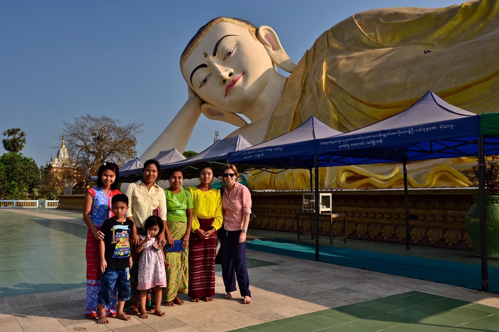 Direkt neben der Shwethalyaung-Pagode liegt eine weitere riesige Buddha-Statue – diesmal jedoch im Freien. Dieser Buddha wurde erst vor etwa zehn Jahren errichtet. Da es keine großen Bäume gibt, die Schatten spenden, wurden unsere nackten Füße auf diesen grünen Fliesen gegrillt. Aber für ein Foto mit einer einheimischen Familie ist natürlich trotzdem Zeit.