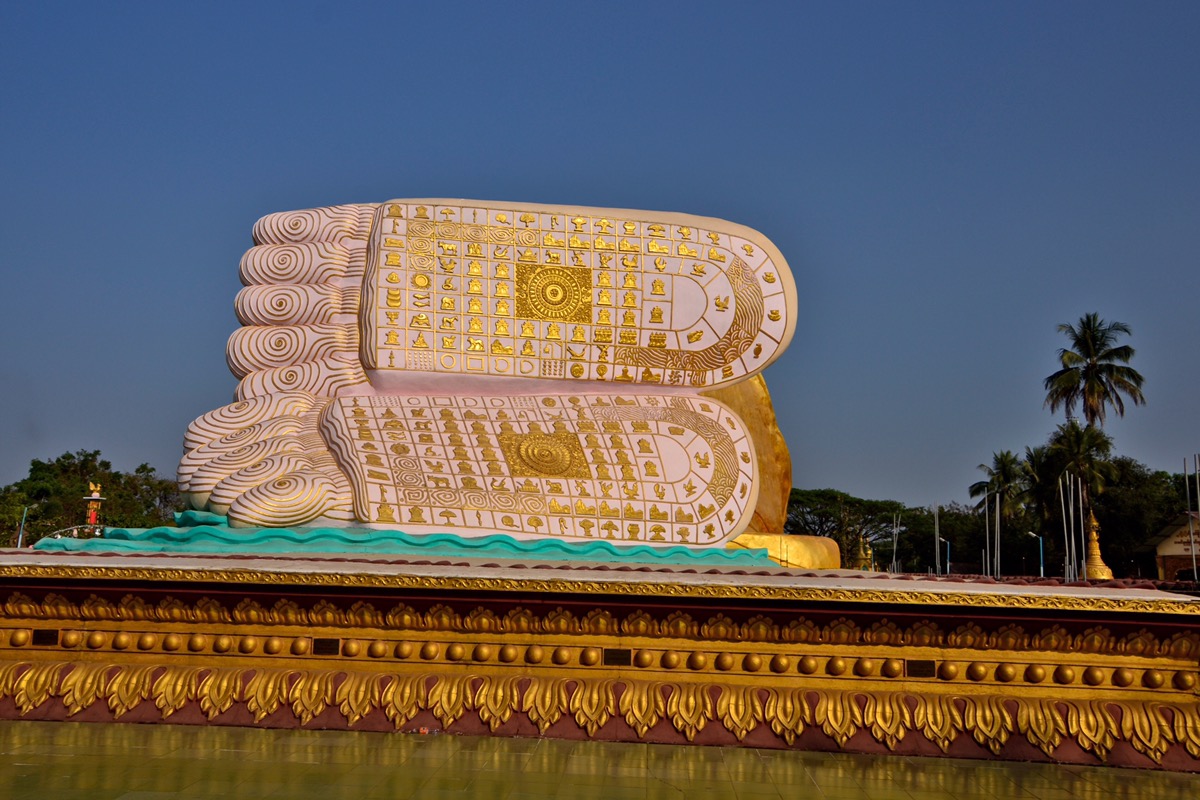 Der liegende Buddha in der Shwethalyaung-Pagode ist mit seiner Länge von mehr als 50 Metern einer der größten Buddha-Statuen der Welt. Diese Position symbolisiert Buddha kurz vor seinem Tod. Dieser Buddha stand draußen, aber um ihn zu schützen, wurde eine (für Fotos unpraktische) Dachkonstruktion gebaut.