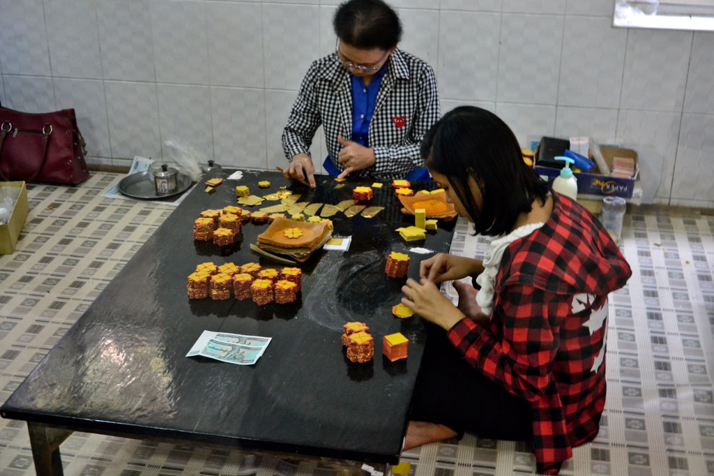 In der 36. Straße in Mandalay befindet sich ein Blattgoldhersteller neben dem anderen Blattgoldhersteller. Kleine Goldnuggets werden von gut ausgebildeten Männern durch rhythmisches Hämmern in extrem dünne Goldblätter verwandelt. Trotz dieser harten Arbeit ist es ein beliebter Job, da die goldenen Blätter für religiöse / höhere Zwecke verwendet werden: Sie werden auf Buddha-Statuen geklebt, um damit Punkte für die Reinkarnation zu sammeln. Einige Buddhas sind mit so vielen goldenen Blättern bedeckt, dass ihre Form bereits schwer zu erkennen ist.