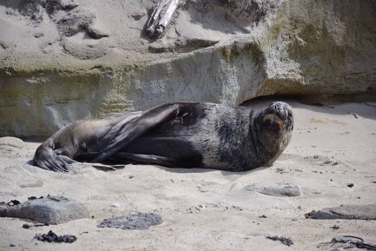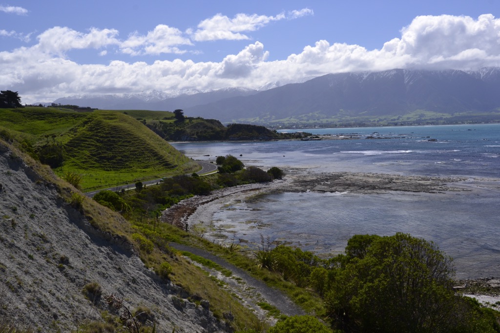 Über das Wetter zu schreiben schien zu helfen. Wir hatten nun einen Tag mit wirklich schönem Sonnenschein, bevor wir die Südinsel von der Ost- zur Westküste überquerten, wo es sowieso häufig regnet. Wir nutzten den sonnigen Tag für einen Spaziergang auf der Halbinsel Kaikoura mit atemberaubendem Blick auf diese wunderschöne Landschaft und einer weiteren Robbenkolonie. Erstaunlich, wie nahe wir den Robben kommen konnten. Aber wir mussten erneut sorgfältig darauf achten, ob der Stein neben uns wirklich ein Stein oder eine Robbe ist. Es ist schwer zu beschreiben, wie beeindruckend die Landschaft hier ist – also ist es besser, wenn ihr euch die Bilder selbst anseht… Darüber hinaus ist Kaikoua bekannt als Heimat von leicht zu beobachtenden Wildtieren wie Wale, Delfine und Albatrosse, die entweder in dieser Gegend leben oder vorbeiziehen.