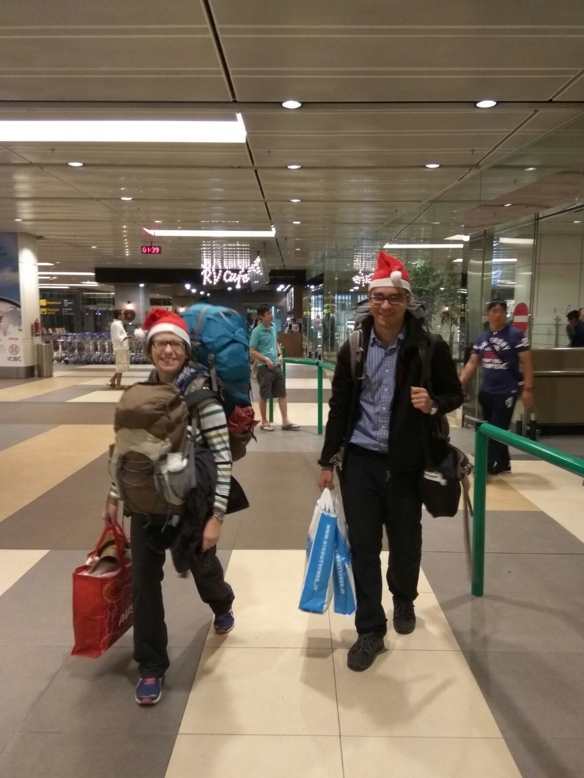 We spent the days between Christmas and New Year’s Eve on our all around the world trip in Singapore staying with friends. Besides exchanging stories about their and our around the world trip we took some time to explore Singapore. The crew of the Jetstar flight we have taken from Osaka to Singapore has distributed Christmas caps for each passenger. Look how our flight looked like afterwards. The many bags we were carrying on arrival in Singapore are not our normal travel luggage. We have been shopping in Japan presents for our friends and in addition we have left a package in Singapore to send it home together with other staff from our friends.