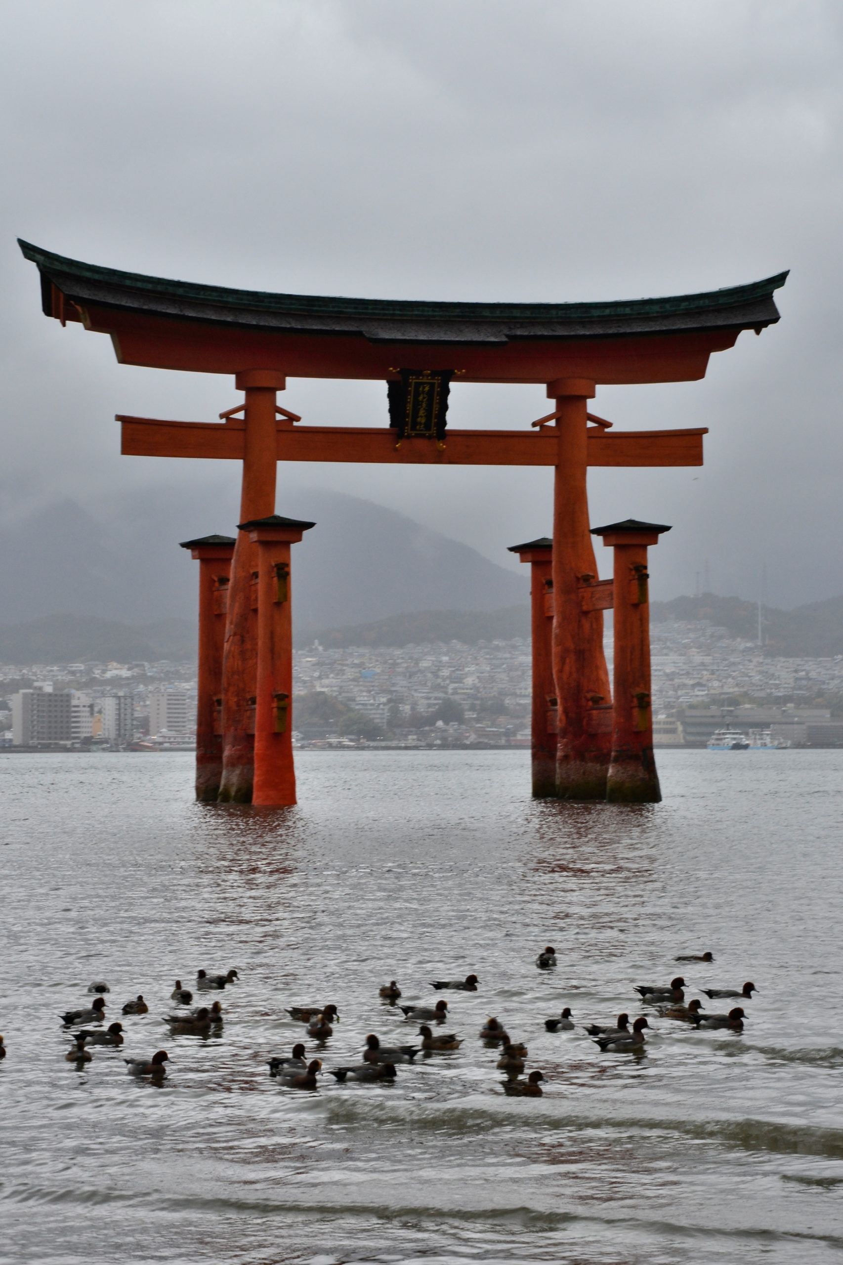 Das wohl berühmteste Bild aus Japan ist das rote Tor, das im Meer vor einem Schrein und den Bergen im Hintergrund steht. Daher ist es einer der meistbesuchten Touristenorte Japans. Dieser Shinto Itsukushima Schrein ist als UNESCO-Weltkulturerbe anerkannt. Das Tor ist ungefähr 16 Meter hoch und das Dach ist 25 Meter breit, so dass wir das Tor bereits vom Boot aus gesehen haben.