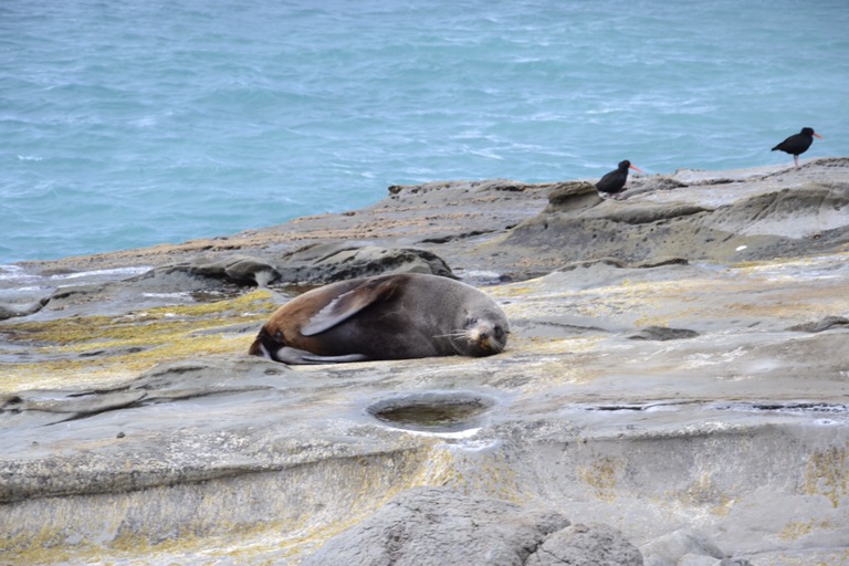 Über das Wetter zu schreiben schien zu helfen. Wir hatten nun einen Tag mit wirklich schönem Sonnenschein, bevor wir die Südinsel von der Ost- zur Westküste überquerten, wo es sowieso häufig regnet. Wir nutzten den sonnigen Tag für einen Spaziergang auf der Halbinsel Kaikoura mit atemberaubendem Blick auf diese wunderschöne Landschaft und einer weiteren Robbenkolonie. Erstaunlich, wie nahe wir den Robben kommen konnten. Aber wir mussten erneut sorgfältig darauf achten, ob der Stein neben uns wirklich ein Stein oder eine Robbe ist. Es ist schwer zu beschreiben, wie beeindruckend die Landschaft hier ist – also ist es besser, wenn ihr euch die Bilder selbst anseht… Darüber hinaus ist Kaikoua bekannt als Heimat von leicht zu beobachtenden Wildtieren wie Wale, Delfine und Albatrosse, die entweder in dieser Gegend leben oder vorbeiziehen.
