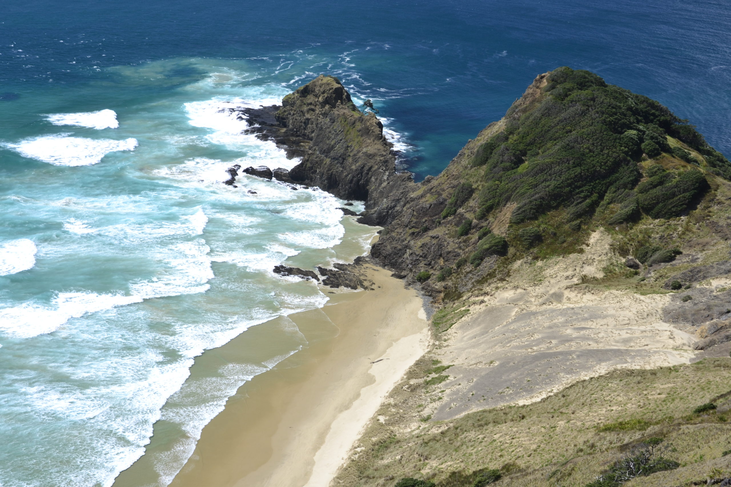 Wie starteten an den Ostbuchten der Nordinsel in der Nähe von Auckland. Kap Reinga im hohen Norden war unser erstes Ziel. Ihr erreicht Kap Reinga nach ca. 90 km von Kaitaia aus. Kap Reinga mit seinem Leuchtturm ist fast der nördlichste Punkt Neuseelands. Es gibt nur eine andere Bucht, die etwas weiter als dieser Punkt ist, diese ist aber nicht zugänglich. Außerdem treffen sich an dieser Stelle die Tasmanische See und der Pazifische Ozean. Infolgedessen können Wellen von bis zu zehn Metern Höhe entstehen (aber nicht als wir dort waren).