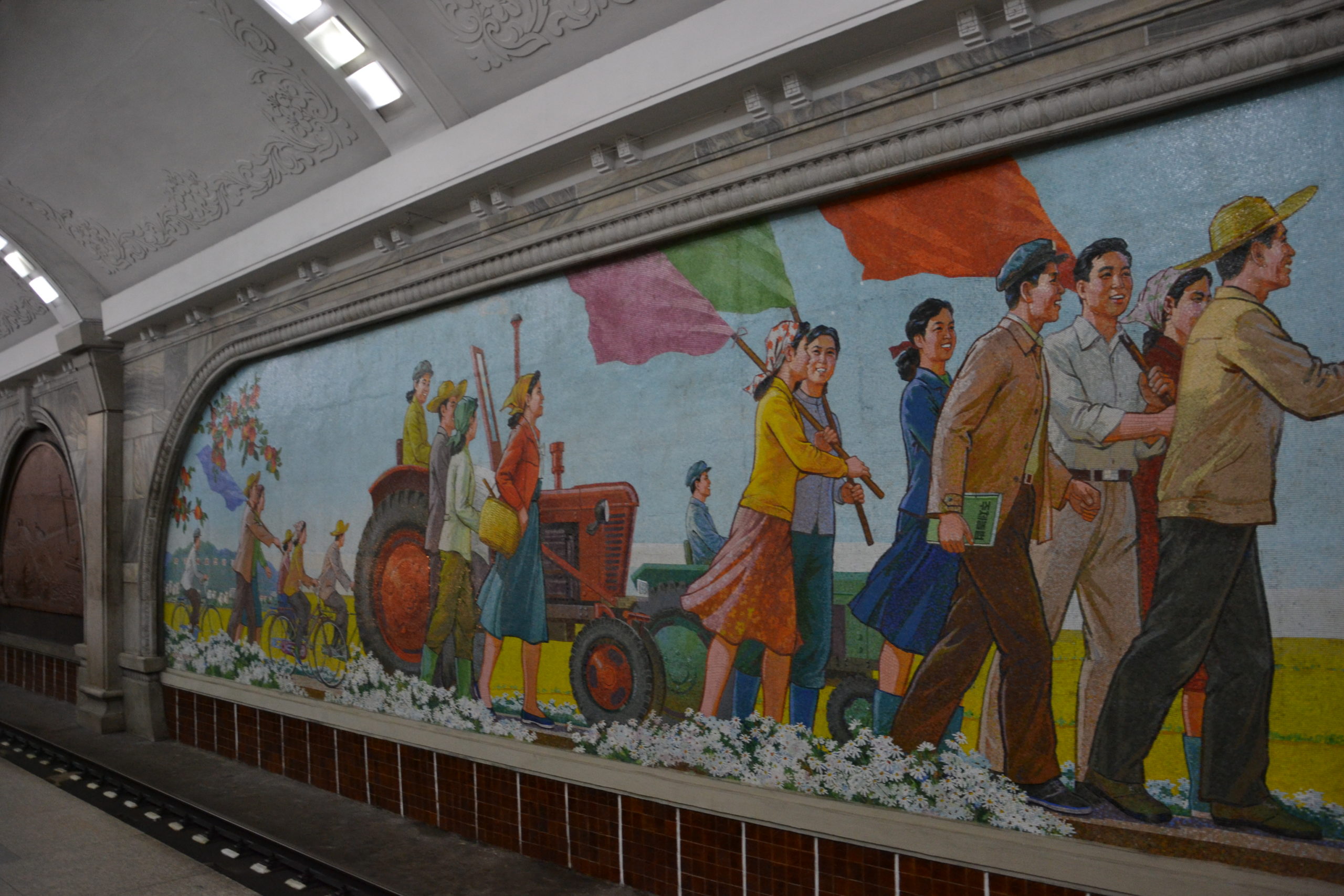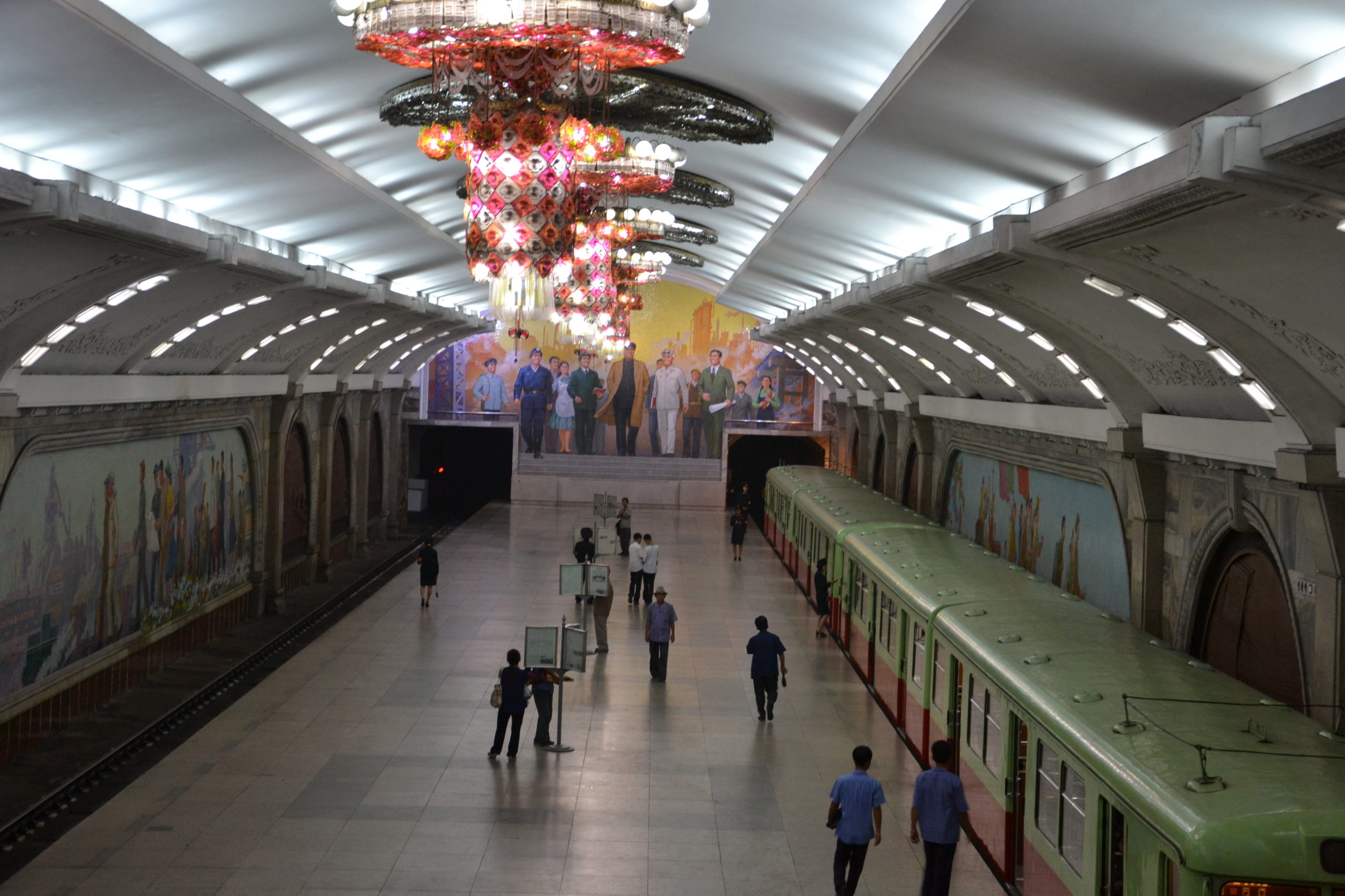 Ein weiteres Highlight in Pjöngjong ist eine Fahrt mit der U-Bahn. Die Koreaner sind sehr stolz auf ihre U-Bahn und die Stationen sind in der Tat sehr schön dekoriert – zumindest die drei Stationen, an denen wir anhalten und aussteigen durften. Die U-Bahnen wurden teilweise aus Ostberlin importiert und wir haben noch deutsche Schilder im Inneren gesehen. Vor allem die U-Bahn scheint wegen der Mobilität beliebt zu sein, da die U-Bahn während der Mittagspause mit Koreanern überfüllt war.
