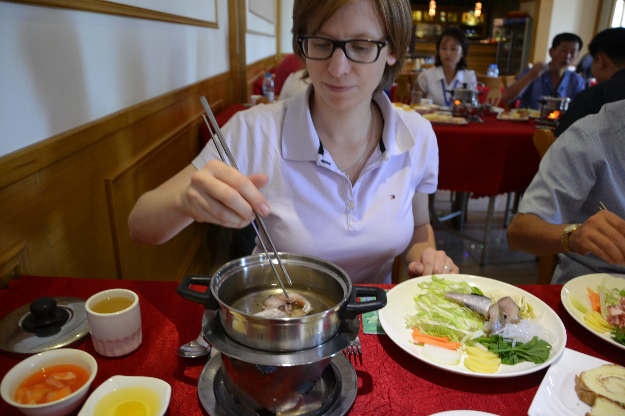 Wir sind wirklich Hotpot- / Fondue-Liebhaber und einer der ersten Hotpots, die wir im Ausland genossen haben, war in Pjöngjang. Jeder hat seinen eigenen Topf bekommen, also haben wir den servierten rohen Fisch und das Gemüse so lange wie möglich gekocht um auf Nummer sich zu gehen.