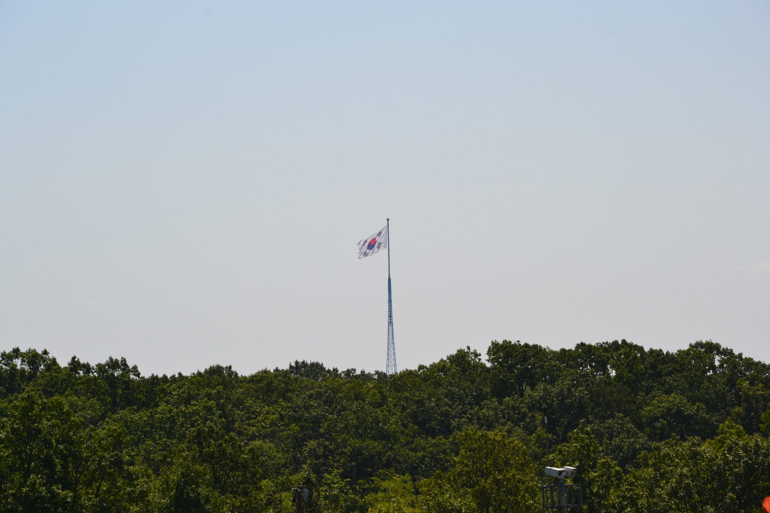 Nach Kaesong zu reisen war unser erstes Ziel außerhalb der Hauptstadt Pjöngjang. Die DMZ teilt die koreanische Halbinsel ungefähr in zwei Hälften und ist ca. 250 Kilometer lang. Dieser Korridor zwischen Nord- und Südkorea ist ca. vier Kilometer breit, aber man kann die südkoreanische Flagge aus dem Norden sehen. Obwohl die Zone entmilitarisiert ist, ist die Grenze hinter diesem Streifen eine der am stärksten militarisierten der Welt. Bevor wir die DMZ betraten, mussten wir unseren Van verlassen und in einen Militärbus umsteigen. Sogar unsere Guides mussten an diesem Kontrollpunkt ihre ID-Karten vorlegen. Während der Analyse unserer Pässe haben wir die Gelegenheit genutzt, Propagandaplakate und Postkarten zu kaufen.