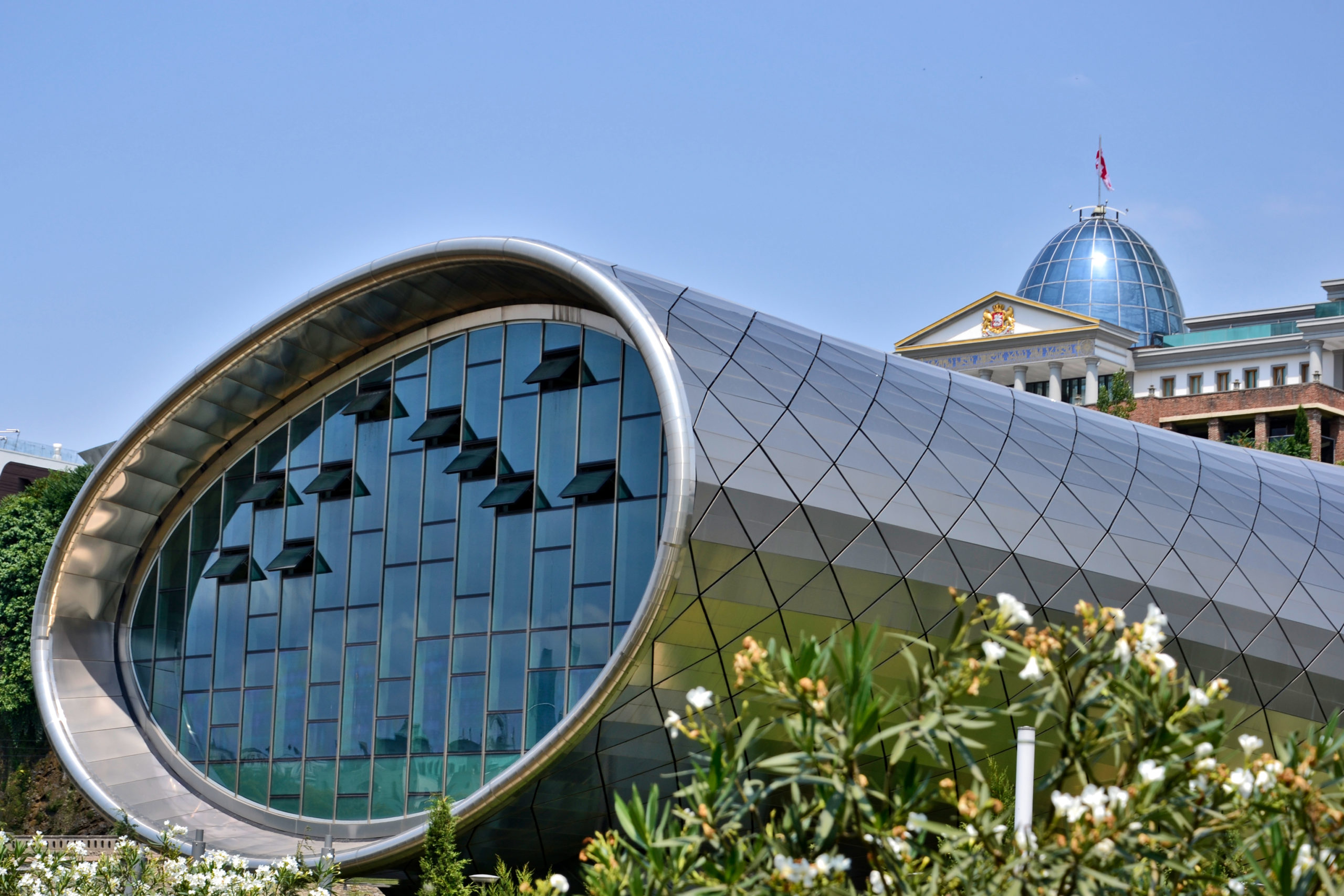 Der futuristische Konzertsaal befindet sich zusammen mit der Friedensbrücke in der Nähe des Flusses Mtkvari. Der Konzertsaal erinnert an einen Lindwurm aufgrund der Röhren, die vom Präsidentenpalast überwacht werden. ????