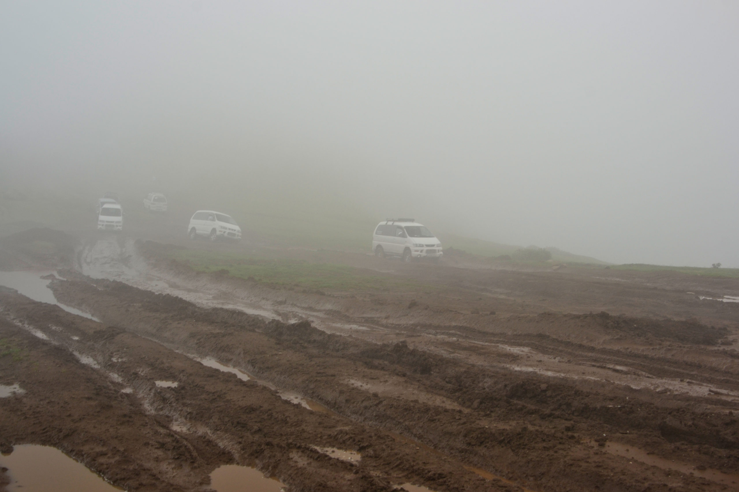 Wir übernachteten in Stepanzminda, um die Zminda Sameba Kirche zu besuchen. Die Kirche auf dem Hügel ist ein beliebter Wallfahrtsort. Da Paul gerne überall hin fährt, mussten wir natürlich das Auto nehmen. Aufgrund des starken Regens in der Nacht zuvor und des Nebels am Morgen waren die schlammigen Schotterstraßen jedoch rutschig und wegen der vorbeifahrenden Busse beschlossen wir, umzudrehen und den in unserem Reiseführer beschriebenen Wanderweg zu suchen. Schließlich erreichten wir die Kirche zu Fuß nach ca. zwei Stunden.