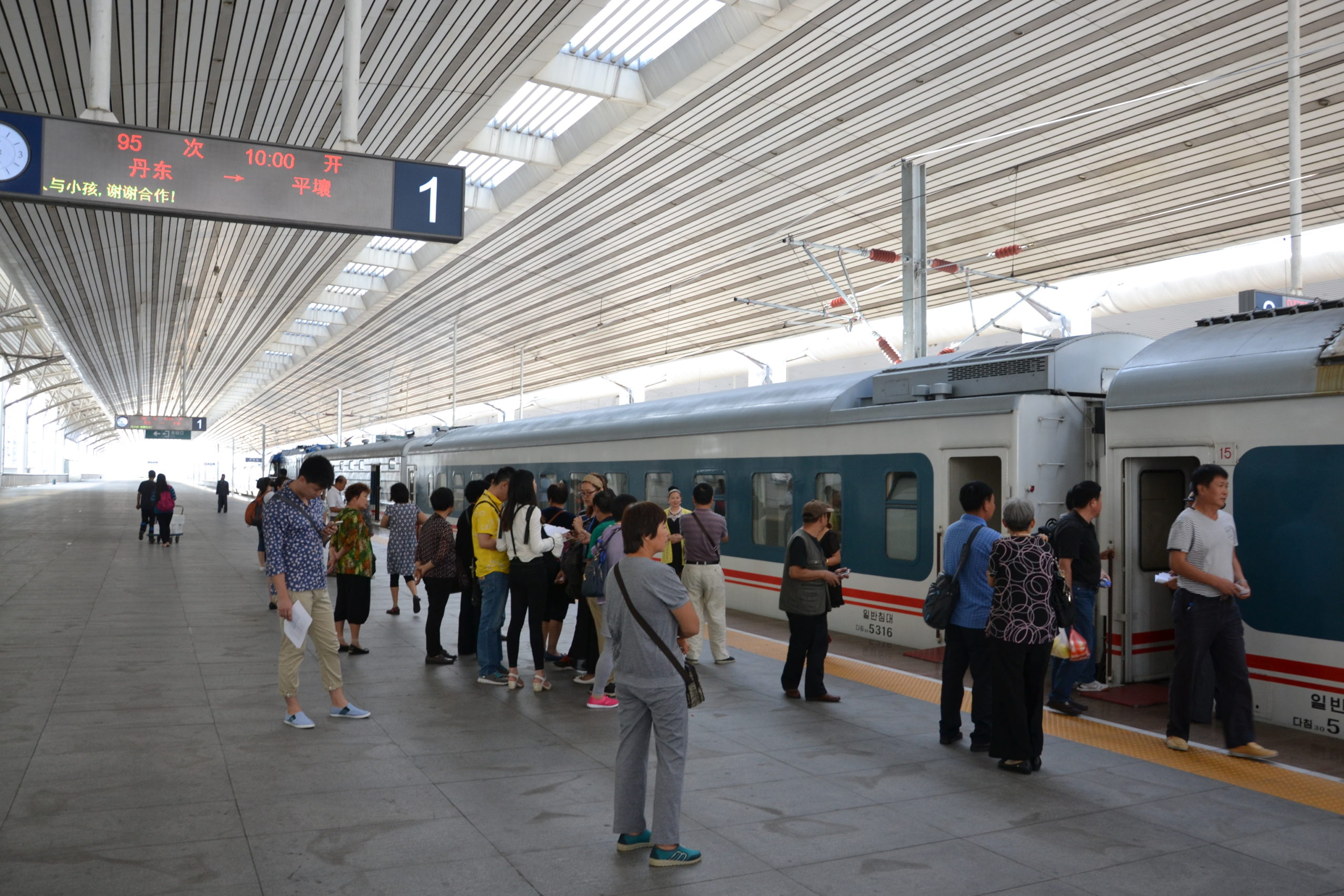 In Dandong sind wir in einen nordkoreanischen Nahverkehrszug umgestiegen, nachdem wir die Ausreisekontrolle in China absolviert hatten. Der Zug war komplett von Koreanern gebucht und wir waren mit nur zwei Niederländern die einzigen Touristen in diesem Zug. Die Einreise nach Nordkorea war ein großer Spaß.