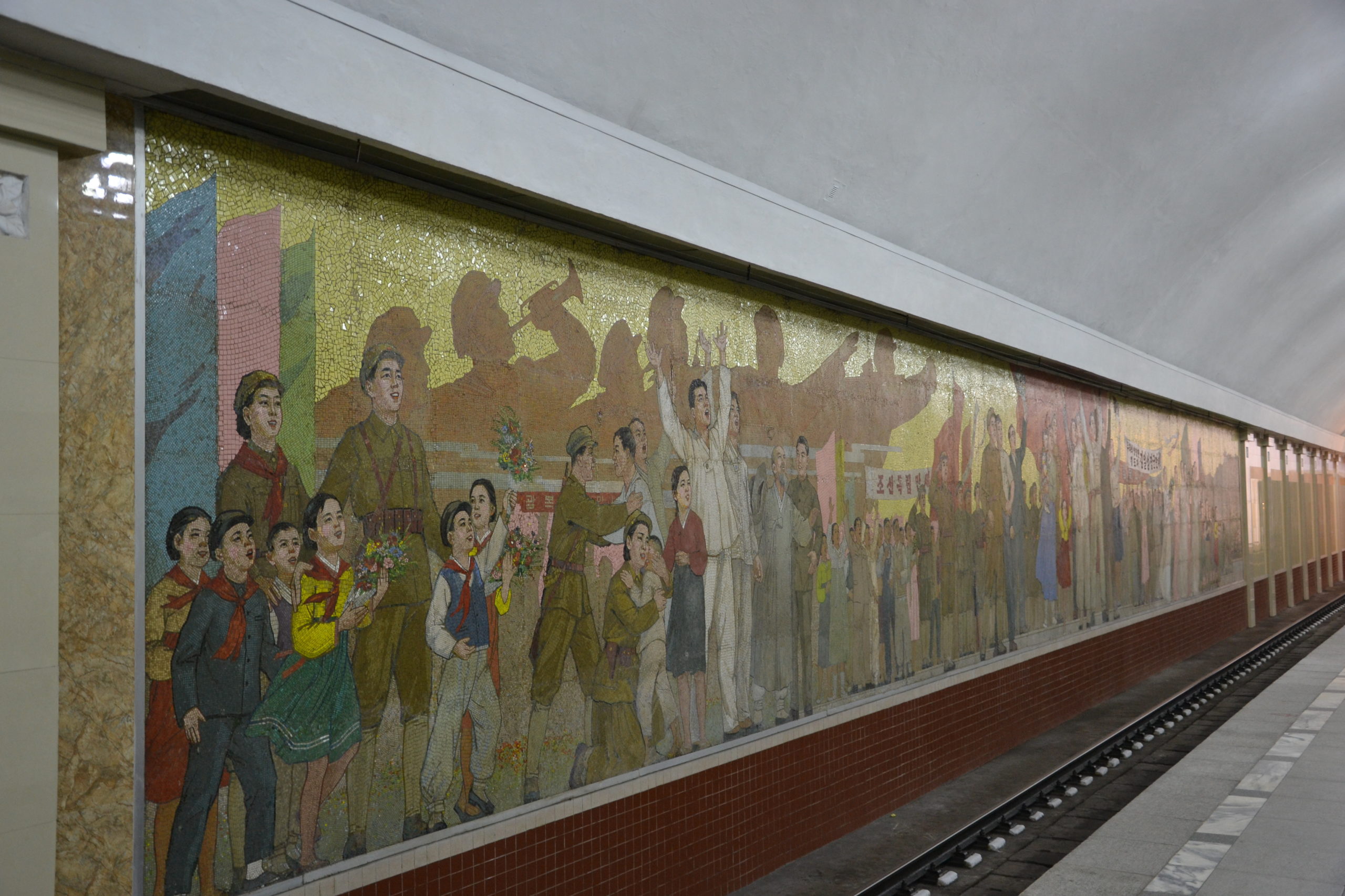 Ein weiteres Highlight in Pjöngjong ist eine Fahrt mit der U-Bahn. Die Koreaner sind sehr stolz auf ihre U-Bahn und die Stationen sind in der Tat sehr schön dekoriert – zumindest die drei Stationen, an denen wir anhalten und aussteigen durften. Die U-Bahnen wurden teilweise aus Ostberlin importiert und wir haben noch deutsche Schilder im Inneren gesehen. Vor allem die U-Bahn scheint wegen der Mobilität beliebt zu sein, da die U-Bahn während der Mittagspause mit Koreanern überfüllt war.