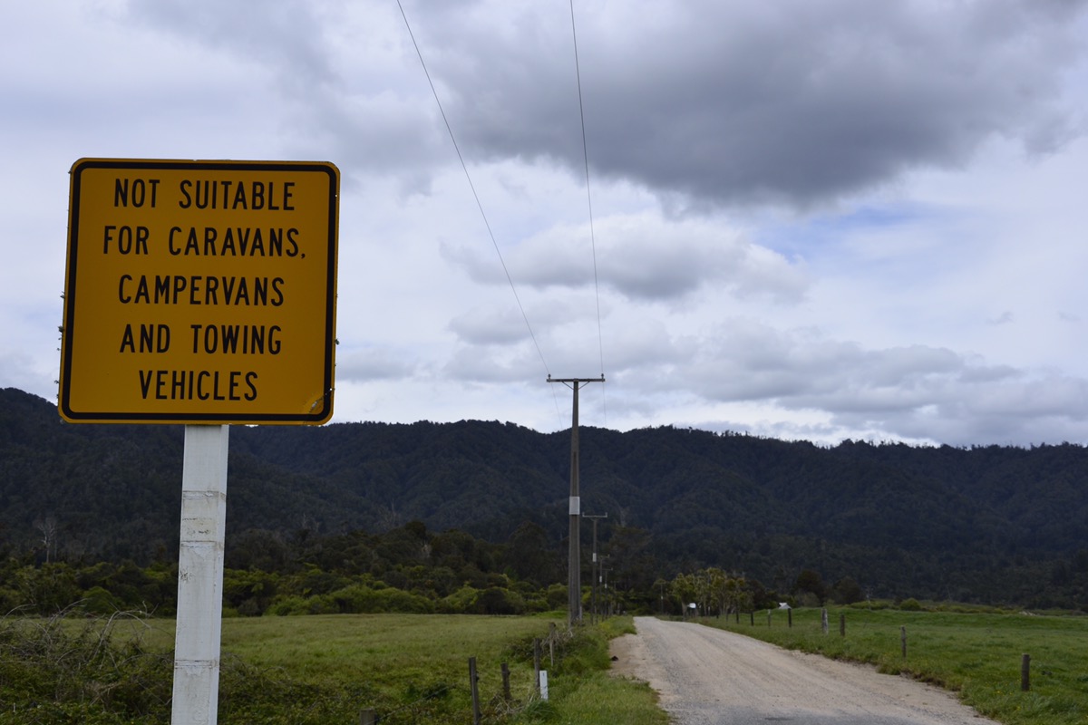In Westport an der Westküste angekommen, mit dem Ziel unsere Reise weiter in den Süden fortzusetzen, lesen wir in unserem Reiseführer über den magischen Ort Opara mit einem großen Brückenbogen über dem Fluss rund 140 km im Norden. Wir beschlossen, diesen Weg zu nehmen und die ursprünglich geplante Route später am Tag in Westport fortzusetzen. Leider können wir keine Bilder zeigen, da ca. 14 km vor Opara das folgende Schild unseren Weg versperrte… Da hat sich der Umweg von mehr als 150 km leider nicht gelohnt und wir sind traurig wieder Richtung Wetsport zurückgefahren.