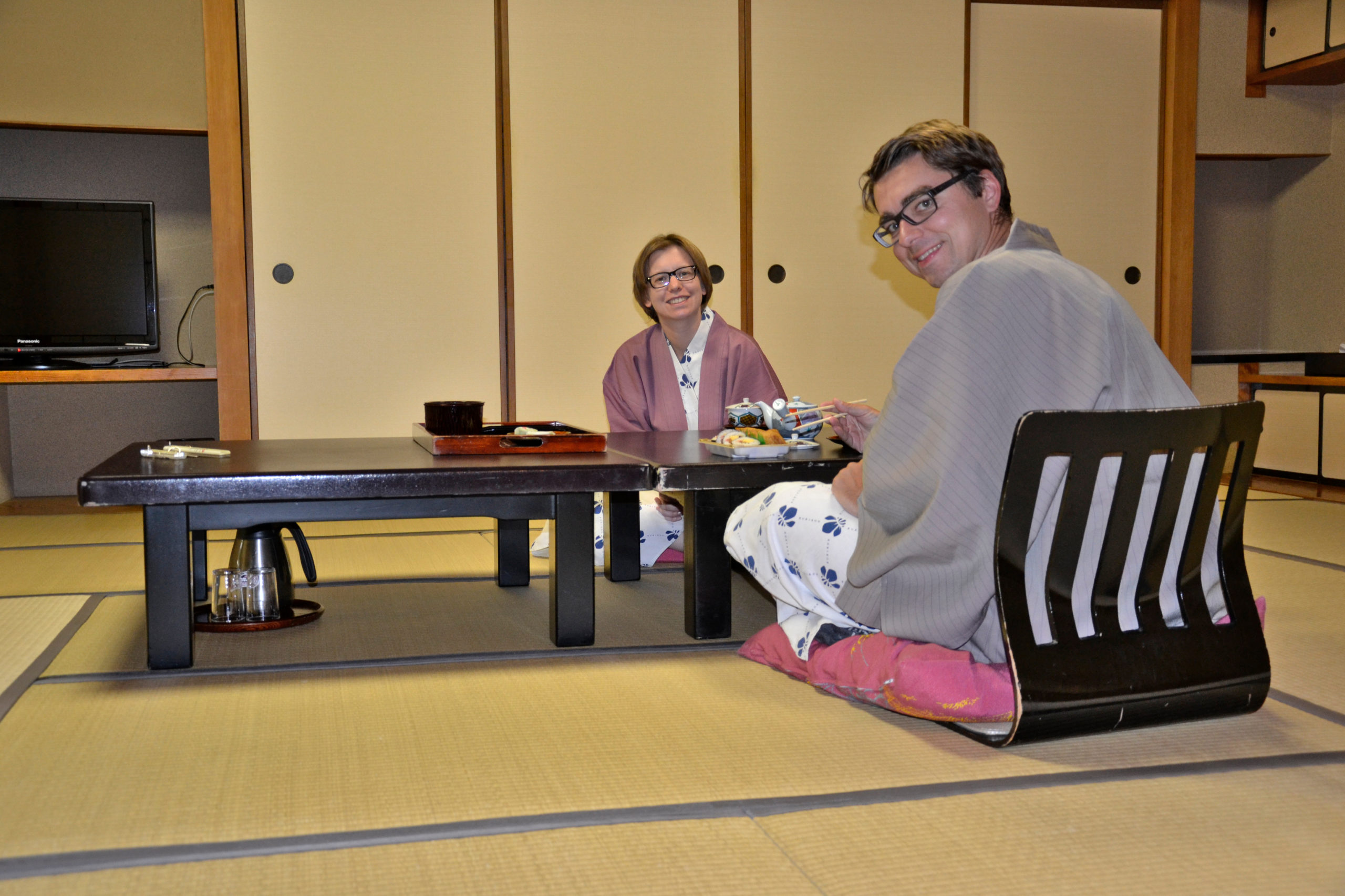 Wir wollten auch die traditionelle Gästehäuser ausprobieren. Zum ersten Mal haben wir eines in Nikko ausgewählt. Ryokans sind heutzutage berühmt für leckeres Essen, gepflegte japanische Gärten, Onsenbad und Höflichkeitsservice. Obwohl die Zimmer auf den ersten Blick sehr schlicht sind und Strohmatten über dem Boden liegen, kompensieren flache Tische mit Sitzkissen, das private Onsen und das authentische Essen alles.