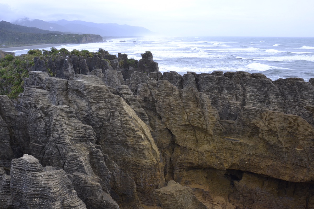Die Felsen im Paparoa-Nationalpark sehen aus wie gestapelte Pfannkuchen. Dieser Bereich zeigt, wie stark die Natur ist, wenn das Wasser durch die Felsen geblasen wird. Bei einem Spaziergang durch den Nationalpark hatten wir einen wunderschönen Blick auf die Felsen und die Blowholes. Der Schicht-Verwitterungs-Prozess hat den Kalkstein geformt, wodurch die Felsen der Form eines Stapels Pfannkuchen gleichen. Der Spaziergang durch den Nationalpark dauert nur 15 Minuten. Dieses Gebiet ist jedoch nur ein kleiner Teil des Nationalparks.