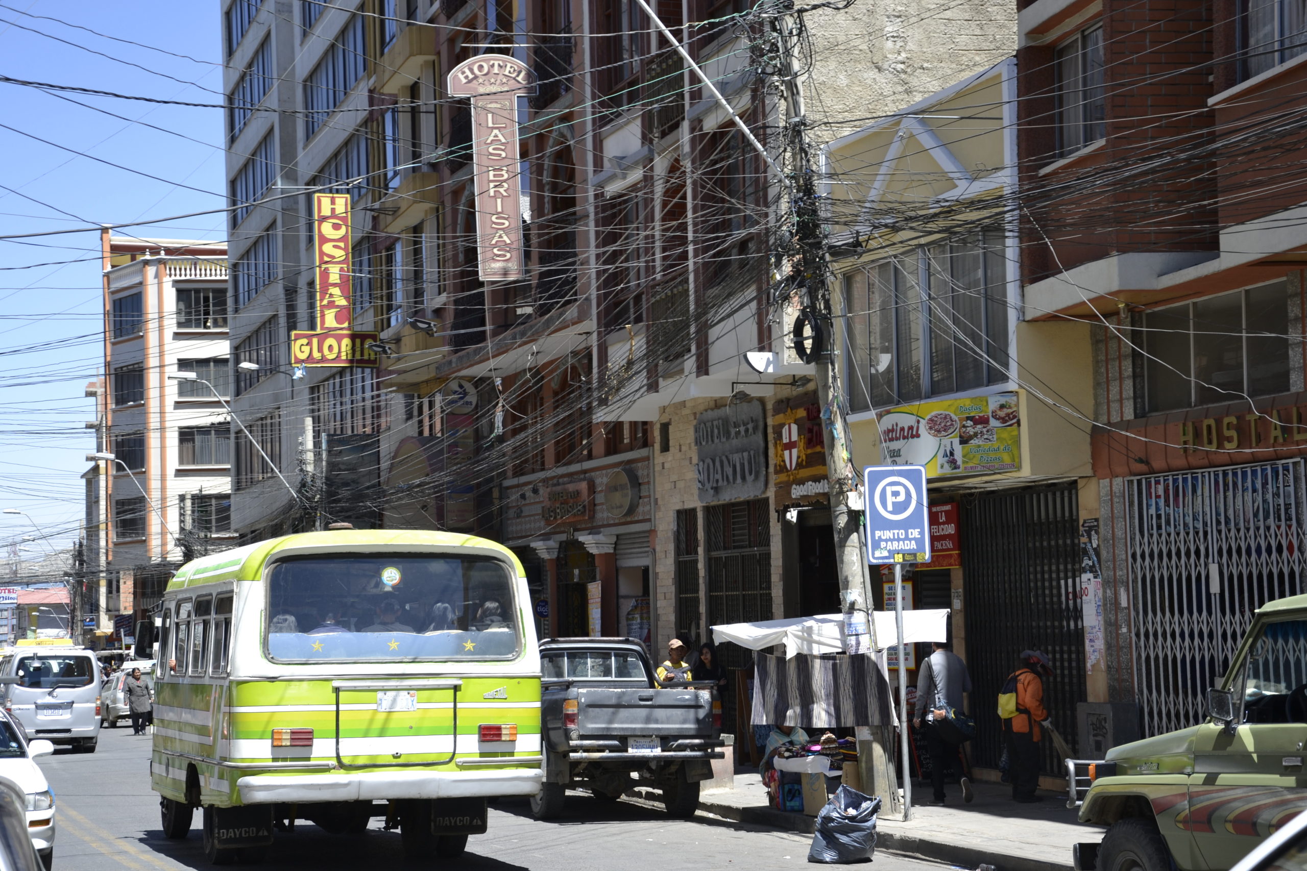 La Paz ist ein städtischer Dschungel, in dem viele Menschen (die meisten von ihnen mit indigenem Erbe) auf den Straßen unterwegs sind, aber mit entspanntem Verkehr (mit Ausnahme der Minibusse). Noch nie haben wir so viele geknotete Stromkabel auf der Straße gesehen. Es ist fast unmöglich, Fotos ohne diese Kabel zu machen.