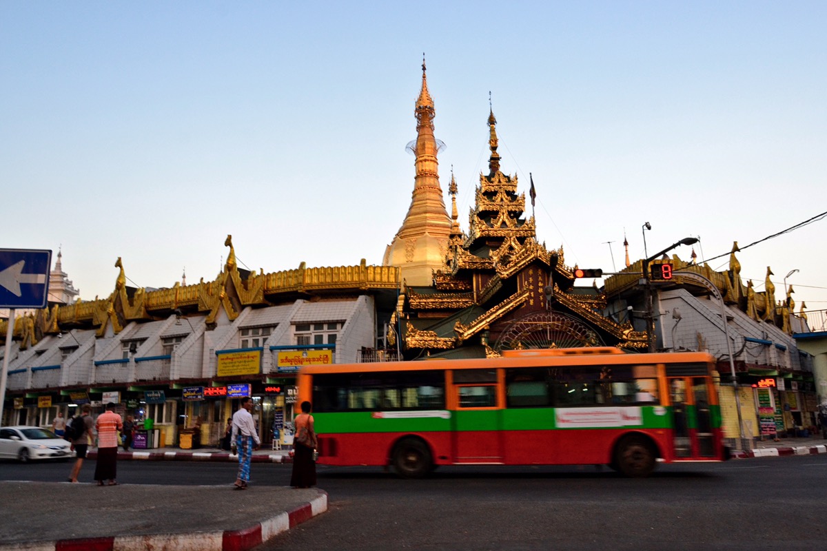 Was ihr in Yangon nicht verpassen solltet, ist der Besuch der Innenstadt. Wir sind mit dem Bus von der Shwedagon-Pagode in die Innenstadt von Yangon gefahren. In der Mitte eines Kreisverkehrs befindet sich eine weitere schöne goldene Pagode (Sule-Pagode).