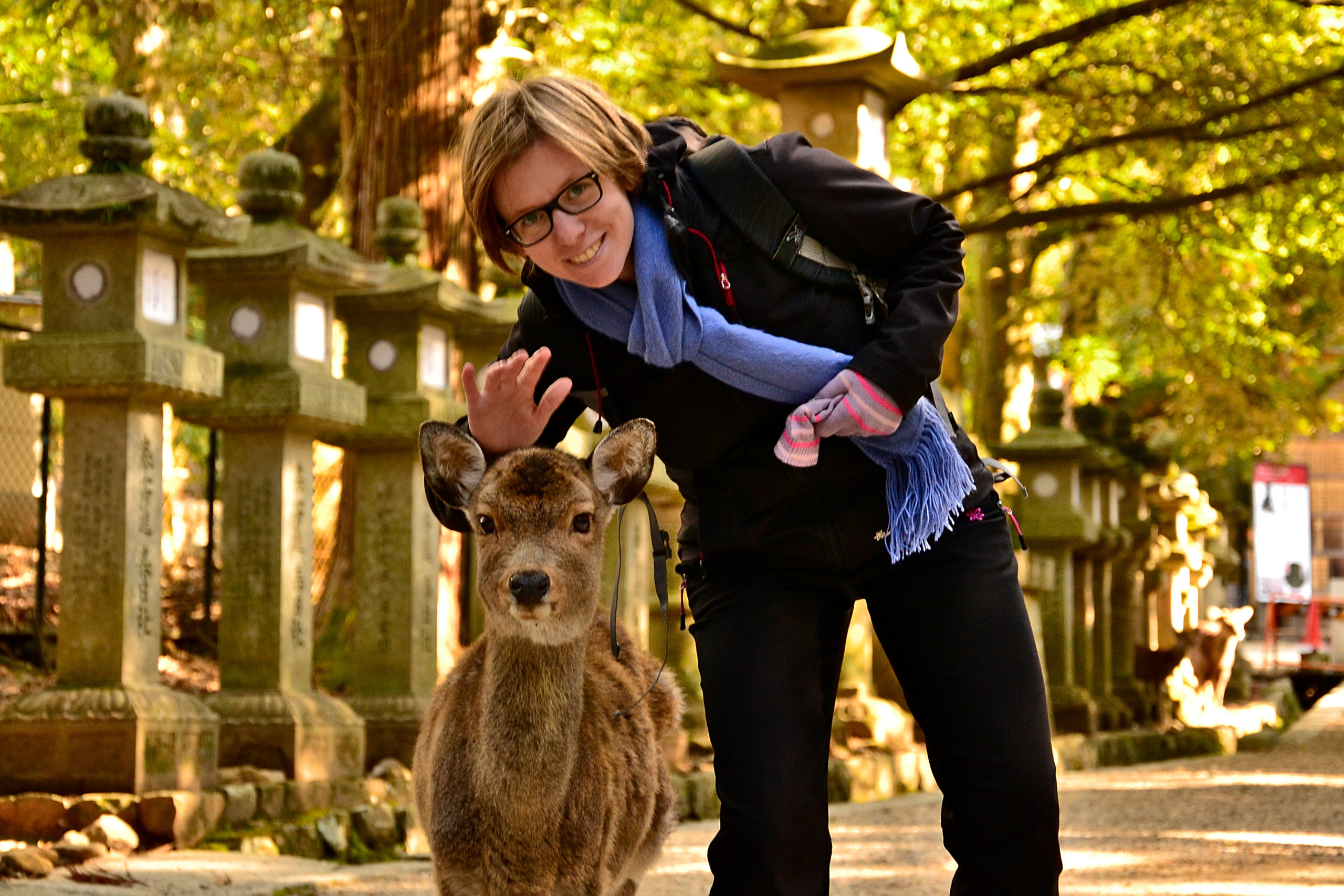 Ein besonderes Erlebnis auf unserer Reise war die Begegnung mit Tieren, die wir bisher nur aus dem Zoo kannten. In Nara besuchten wir den Nara-Park voller Hirsche ohne Zäune. Die Hirsche sind an Menschen gewöhnt. Wenn jemand die angebotenen speziellen Hirschkekse kauft, rennt ein Hirsch auf den Keksbesitzer zu. Aber Selfies ohne Kekse scheinen nicht ihr Favorit zu sein … In dieser Gegend leben ungefähr 1.200 Hirsche. Die Hirsche galten in vorbuddhistischer Zeit als Botschafter der Götter und genießen daher den Status nationaler Schätze.