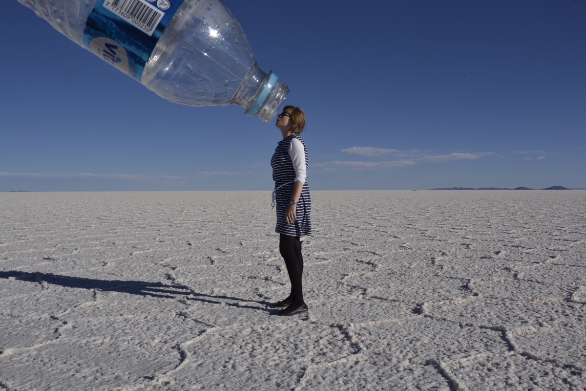 Der Salzsee oder heutzutage die Salzwüste in der Nähe von Uyuni ist mit rd. 10.000 km² die größte der Welt. Das gesamte Gebiet auf 3.650 m über dem Meeresspiegel ist mit Salz bedeckt und sieht aus wie Schnee mit einer interessanten Struktur. Entfernungen sind aufgrund des insgesamt weißen Bereichs nicht erkennbar, was zu merkwürdigen und sehr beliebten Fotos führt. Folglich haben wir an einem einzigen Tag 421 Fotos gemacht…