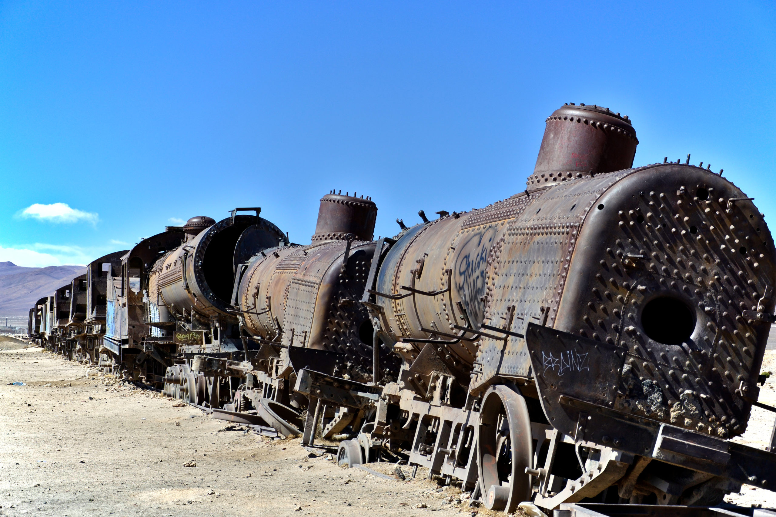 Neben dem beliebten Salzsee gibt es in Uyuni einen Zugfriedhof, auf dem eine sehr große Anzahl historischer Dampflokomotiven in der Wüste vor sich hin rosten. Einige von ihnen sind ungefähr 100 Jahre alt. Leider gibt es kein Museum für sie. Und deshalb wurden Stücke von den Lokomotiven ausgebaut und für Möbel in Bars um Uyuni oder für Statuen in der Innenstadt verwendet. Es macht wirklich Spaß, in die Züge zu steigen und durch dieses Museum mit freiem Eintritt zu gehen.