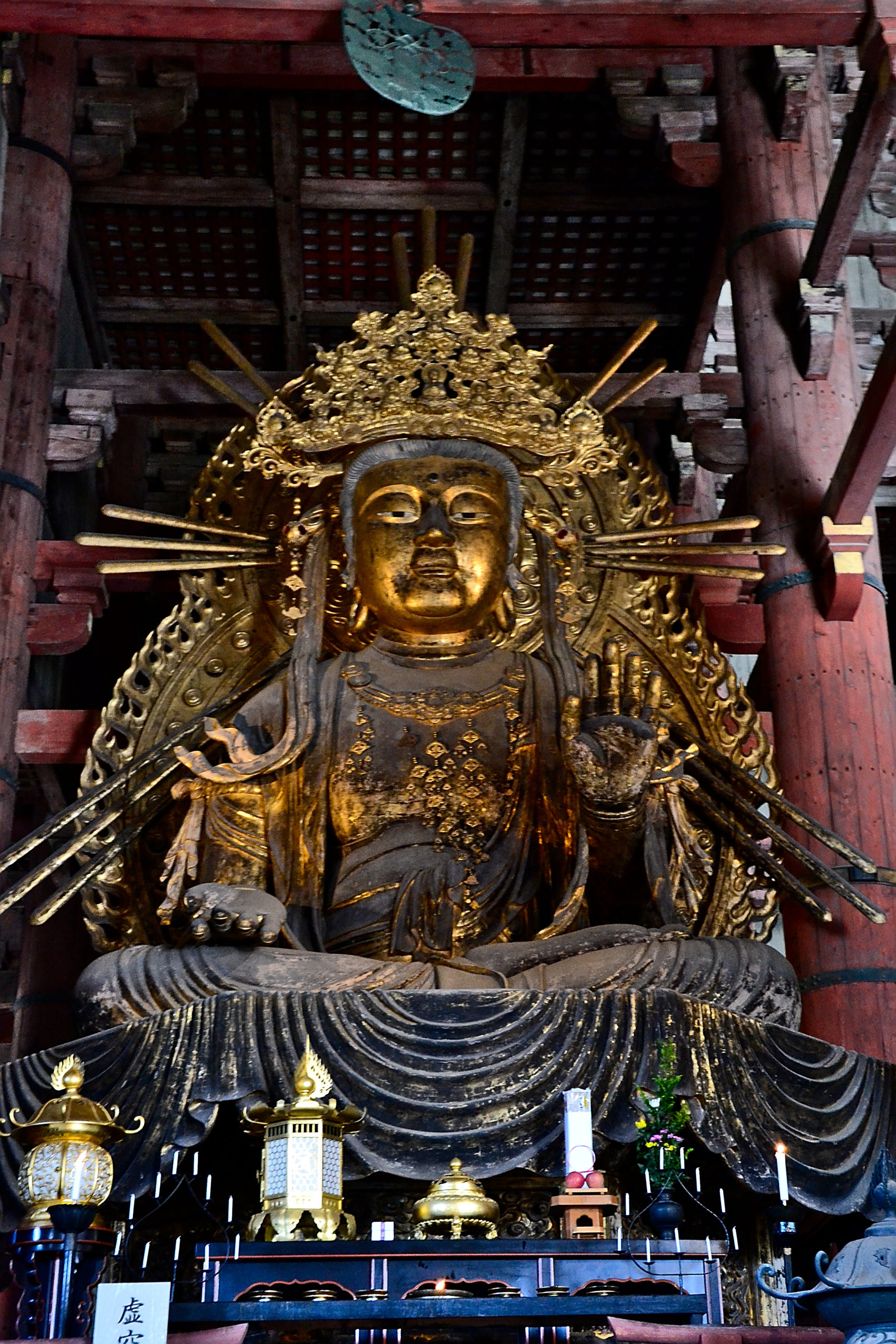 Die Hirsche leben um den Tempel von Todai-ji. Der Tempel selbst ist das größte Holzgebäude der Welt. Dieser riesige Tempel beherbergt die 16,2 Meter hohe Statue des Großen Buddha (Daibutsu). Die Buddha-Statue ist eine der größten Bronzefiguren der Welt und wurde ursprünglich im Jahr 746 gegossen. Die heutige Statue mit ihren 15 Metern besteht aus 437 Bronzetönen und 130 kg Gold. Rund um den Haupttempelsaal befinden sich mehrere Hallen.