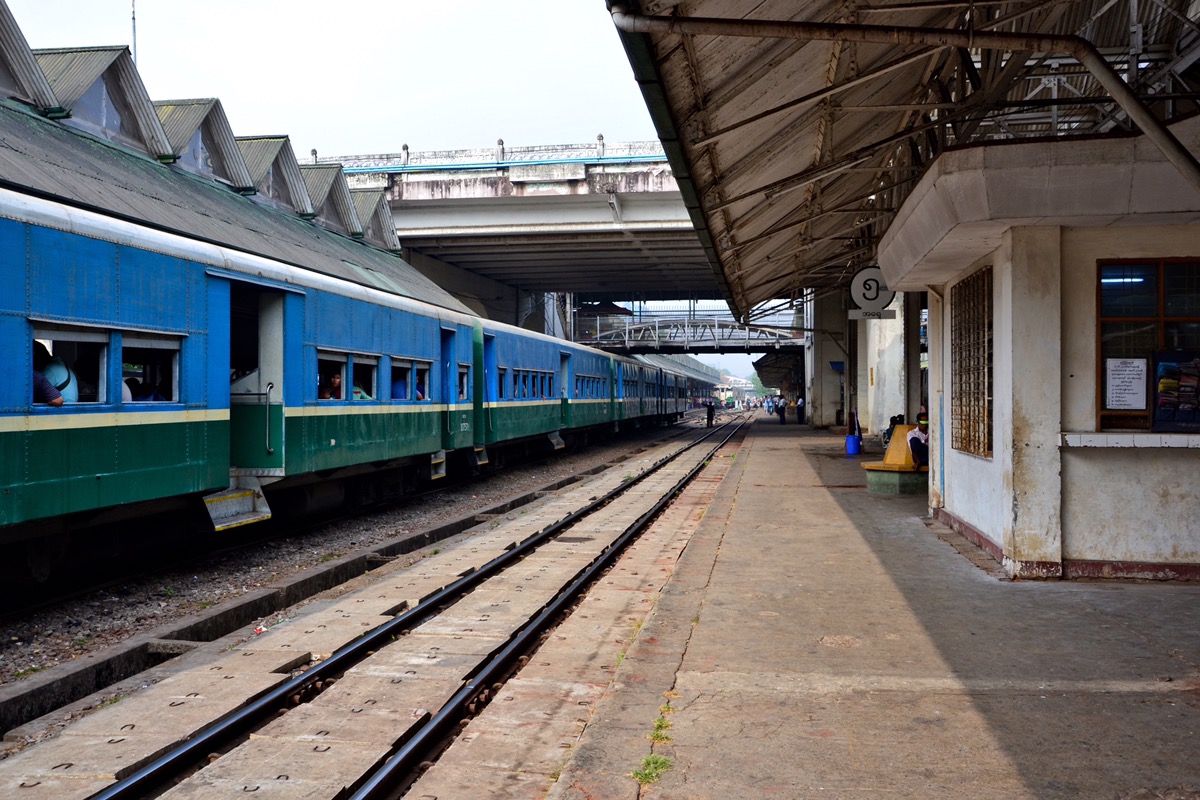Bago ist nur 80 km von Yangon entfernt und so beschlossen wir, einen Zug zu nehmen, um dorthin zu gelangen. In unserem Zug waren konstant die Fenster offen (und ließen sich nicht schließen) und auch die Tür schloss sich während der Fahrt nicht, aber aufgrund der geringen Geschwindigkeit des Zuges war es so eine angenehme Fahrt. Der Bahnhof in Yangon sieht aus wie ein ursprüngliches Erbe aus der Kolonialzeit.