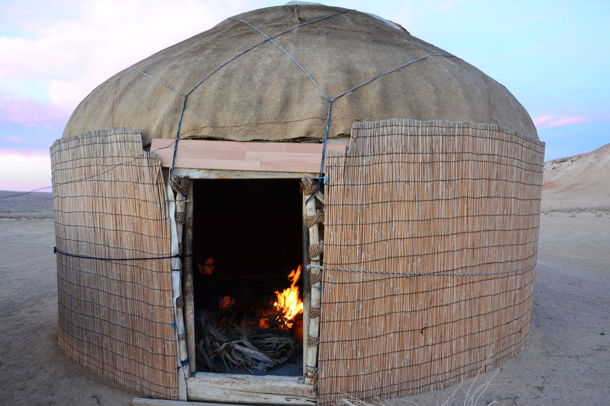 We spent the night nearby the crater in a traditional yurt so that we had the possibility to walk in the night to the crater. This was also the reason why we stopped on our way to the crater to collect some wood. Dmitri prepared on the fire a dinner with traditional salads for us inside of the yurt. Since it was end of December it was pretty cold so that the fire inside the yurt had to burn the whole night.