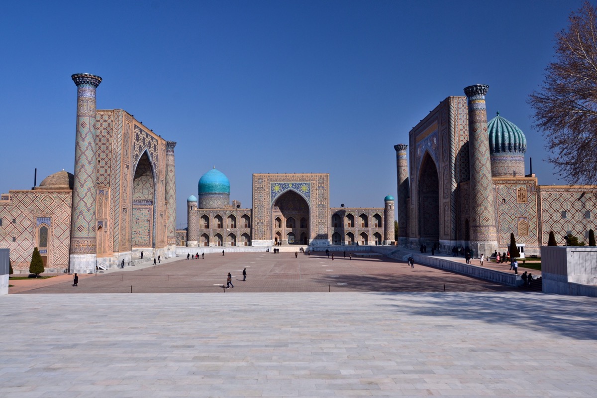 Samarkand ist berühmt für das riesige Registan und wird von der UNESCO als Weltkulturerbe eingestuft („Samarkand – Kreuzung der Kulturen“). Der Registan bildet das Zentrum der Altstadt, in dem sich drei Medressen (Islamische Hochschulen) gegenüberstehen. Jede der Madrasa hat ein einzigartiges und farbenfrohes geometrisches Mosaikdesign, das in der Sonne scheint. Mit sechs Straßen, die durch den Platz führen, war es auch das kommerzielle Herz der Stadt im 14. Jahrhundert und eine Verbindung zur Zitadelle von Timur.