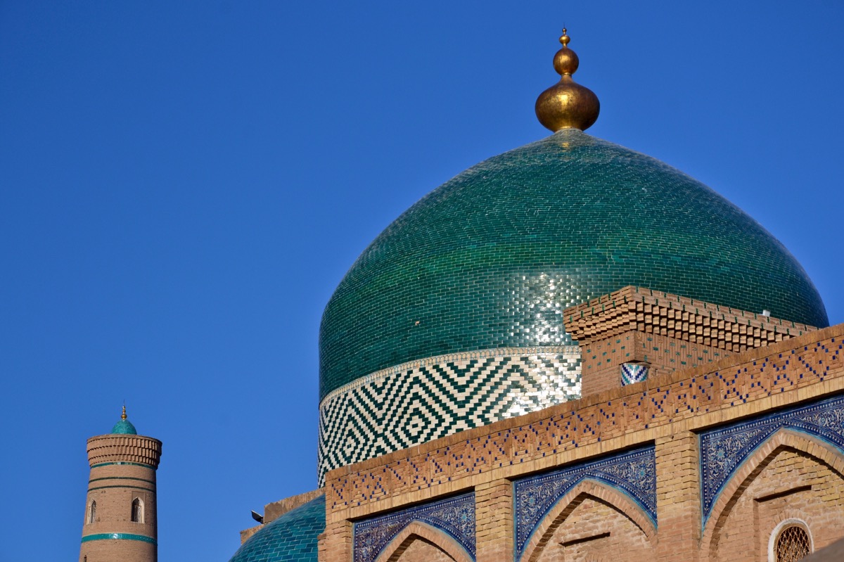 Wir können nicht genug von den schönen türkisfarbenen Fliesen bekommen, welche die Denkmäler schmücken und in großem Kontrast zu dem Sand stehen, der die Gebäude umgibt. Das erste Denkmal, das uns aufgefallen ist, war das vergleichsweise kurze, aber farbenfrohe Minarett. Die wahrscheinlichste Theorie ist, dass der Architekt versprochen hat, dass das höchste Minarett in Buchara und nicht in Chiwa gebaut wird.