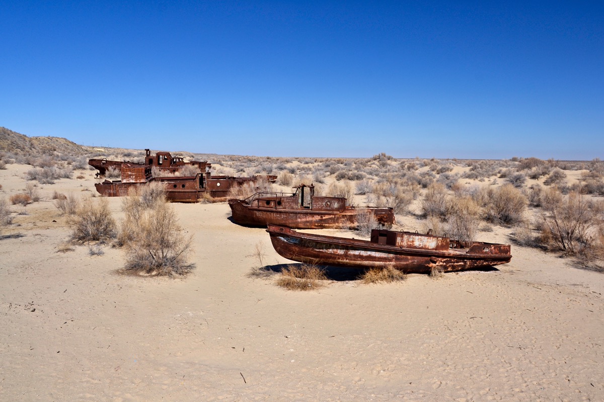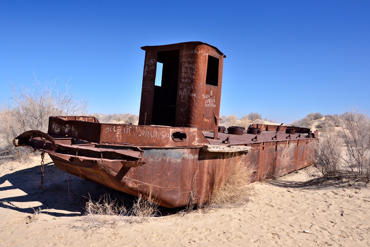 Moynak is one of the big city in this region was half a century ago located at the shore of the Aral Sea and a proud fishing community. Today, the Aral Sea is more than 150 km away. Ships once floating in the sea are now standing and rusting in the dried out sea at the ship graveyard.