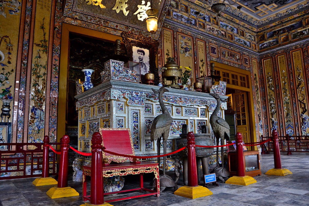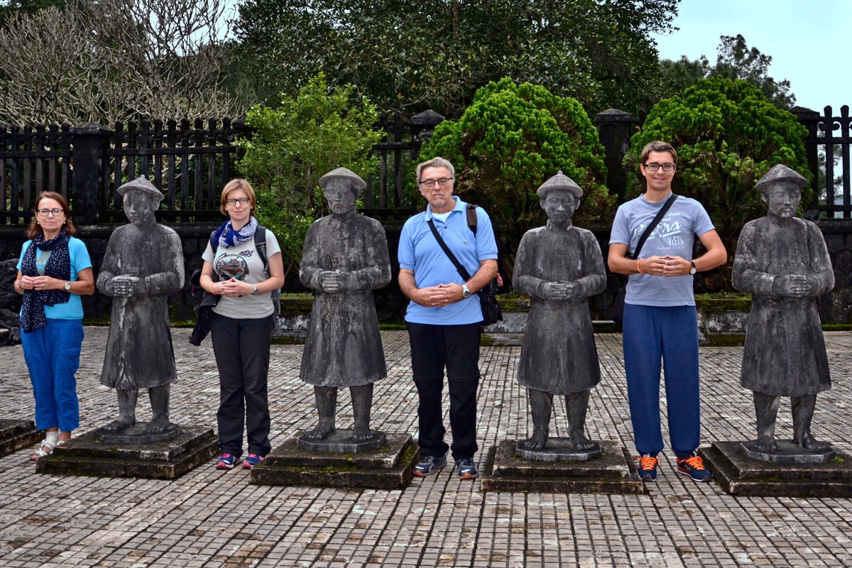The tomb of the last emperor Khai Dinh is a huge area with the main building in a combination of Vietnamese and French architecture. The mandarins and the animals are guarding the tombs in a way similar to the Terra-cotta warriors in China. These stone mandarins are all quite small since it was not allowed that they are taller than the emperor. The tomb itself looks rather like a palace with its impressive mosaic decoration.